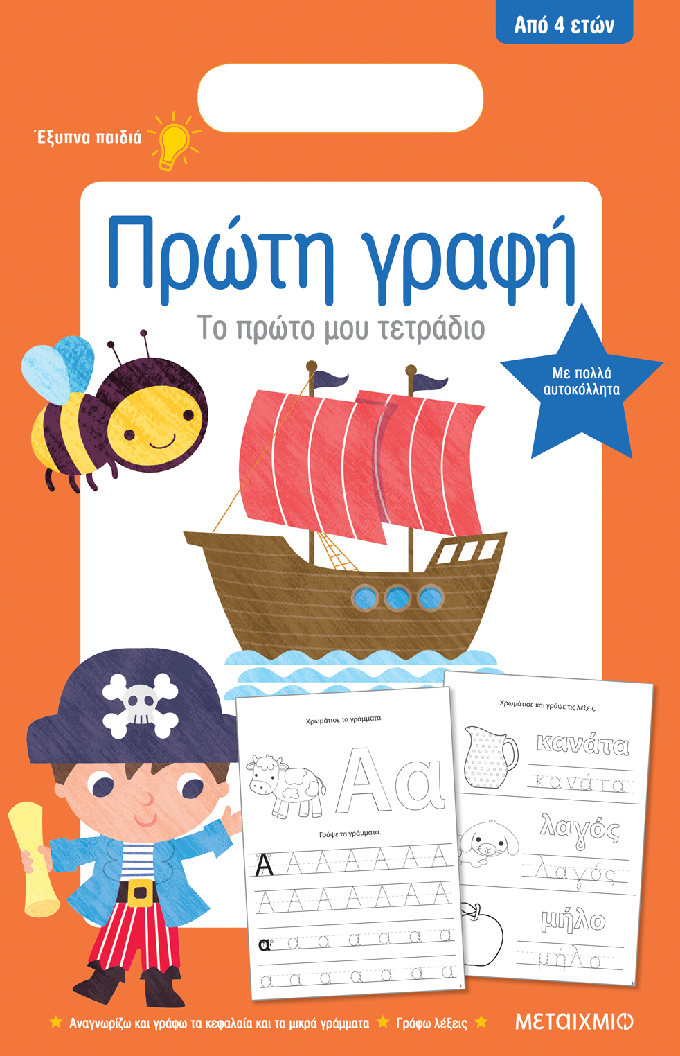 Η μάθηση γίνεται παιχνίδι χάρη στις απλές δραστηριότητες που στοχεύουν στην άσκηση οπτικοκινητικών δεξιοτήτων και στη γνωριμία με τα γράμματα: • Τα παιδιά αναγνωρίζουν και γράφουν τα κεφαλαία και τα μικρά γράμματα • Γράφουν απλές λέξεις.