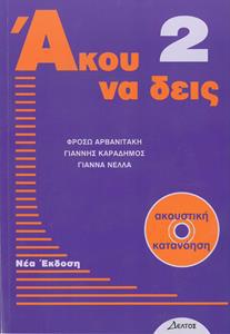 Η σειρά "Άκου να δεις" έχει ως σκοπό την ενίσχυση της ακουστικής κατανόησης του ξενόγλωσσου μαθητή που μαθαίνει ελληνικά. Αποτελείται από 3 βιβλία και 3 CD, και μπορεί να χρησιμοποιηθεί ως συμπληρωματικό υλικό για οποιοδήποτε εγχειρίδιο διδασκαλίας της Ελληνικής ως ξένης γλώσσας, ανάλογα με το επίπεδο του μαθητή. Το "Άκου να δεις 2" απευθύνεται σε μαθητές μέσου επιπέδου και αποτελείται από: -ένα CD με διαλόγους, κείμενα και συνεντεύξεις που βασίζονται σε ρεαλιστικές καταστάσεις, και -ένα βιβλίο με ασκήσεις ακουστικής κατανόησης, τα κείμενα, τις συνεντεύξεις και τους διαλόγους που ακούγονται στο CD, και τις λύσεις των ασκήσεων.