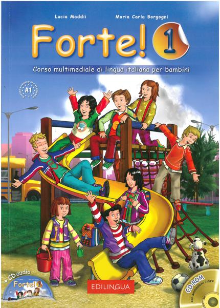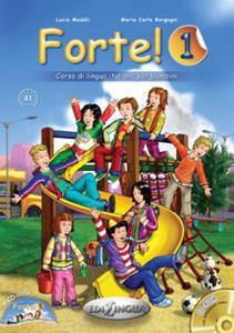 Forte! è un corso originale e innovativo per bambini dai 4 agli 11 anni che si avvicinano all’apprendimento della lingua italiana in Italia o all’estero. Il corso comprende: Piccolo e forte! A e Piccolo e Forte! B (volumi propedeutici), Forte! 1 (A1), Forte! 2 (A1+) e Forte! 3 (A2). Il Libro dello studente ed esercizi di Forte! 1 offre: 1 unità introduttiva + 6 unità, che hanno come filo conduttore una simpatica storiella e sono suddivise a loro volta in tre sottounità introdotte da un’attività motivante che richiama la storia che fa da sfondo. Seguono attività di comprensione e produzione, canzoni e filastrocche. Al termine di ogni unità si trova la sezione Vocabolario per la ripresa delle parole impiegate. 2 Intervalli!!!, ricchi di attività e giochi stimolanti e divertenti per il riepilogo delle conoscenze. La sezione Esercitiamoci!, utile per il consolidamento e il reimpiego delle strutture. L’angolo della grammatica, che presenta box grammaticali riassuntivi, formule ed esempi d’uso. L’angolo del taglia e incolla, in appendice, con le immagini e le frasi da ritagliare e utilizzare durante le attività proposte. 1 CD audio, allegato al Libro dello studente, contenente i brani di ascolto e le canzoni; 1 CD-ROM, allegato al Libro dello studente senza costi aggiuntivi, contenente per ogni unità il video di un dialogo in animazione 3D, con o senza sottotitoli e tutte le canzoni in versione karaoke.