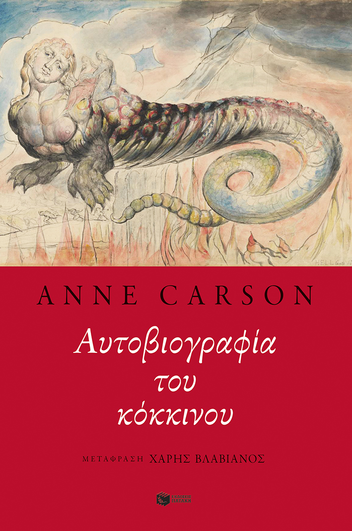 Η μεγάλη ποιήτρια της εποχής μας με την «Αυτοβιογραφία του κόκκινου» μας παραδίδει ένα έργο που είναι μυθιστόρημα και ποίημα μαζί, ιδιοφυής αναδημιουργία ενός αρχαιοελληνικού μύθου και υπέροχη σύγχρονη ιστορία ενηλικίωσης.