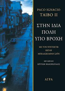 Μυθιστόρημα για το φόβο, ιλαροτραγωδία αλλά και ύμνος για μια πολιτεία σε αποσύνθεση, το Στην ίδια πόλη υπό βροχή είναι η δεύτερη περιπέτεια με πρωταγωνιστή τον μονόφθαλμο ιδιωτικό ντετέκτιβ του Πάκο Τάιμπο που κυκλοφορεί στις Εκδόσεις Άγρα. Την τελευταία φορά, στο Χωρίς αίσιο τέλος , τον είχαμε αφήσει να κείται μπρούμυτα, με το σώμα του διάτρητο από σφαίρες, σ` έναν βρεγμένο δρόμο της Πόλης του Μεξικού.