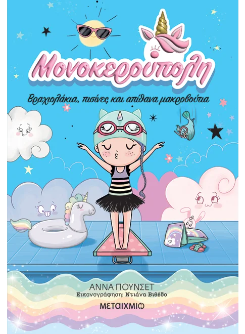 Το καλοκαίρι έφτασε στη Μονοκερούπολη και η Κλαυδία με τις φίλες της μπορούν επιτέλους να απολαύσουν την πισίνα Ουράνιο τόξο. Εδώ, τα γυαλάκια είναι μαγικά, το νερό είναι πολύχρωμο και ο βυθός κρύβει ένα σωρό μυστικά. Η Κλαυδία είναι εξαιρετική κολυμβήτρια, αλλά, αν και ντρέπεται πολύ να το παραδεχτεί... δεν ξέρει να κάνει μακροβούτια! Οχ! Θα μπορούσε να μείνει στον αφρό, αλλά μόνο πηγαίνοντας παρακάτω θα ανακαλύψει τους θησαυρούς της πισίνας του ουράνιου τόξου και κάτι ακόμα πιο πολύτιμο... Θα τα καταφέρει άραγε να μάθει να βουτάει;