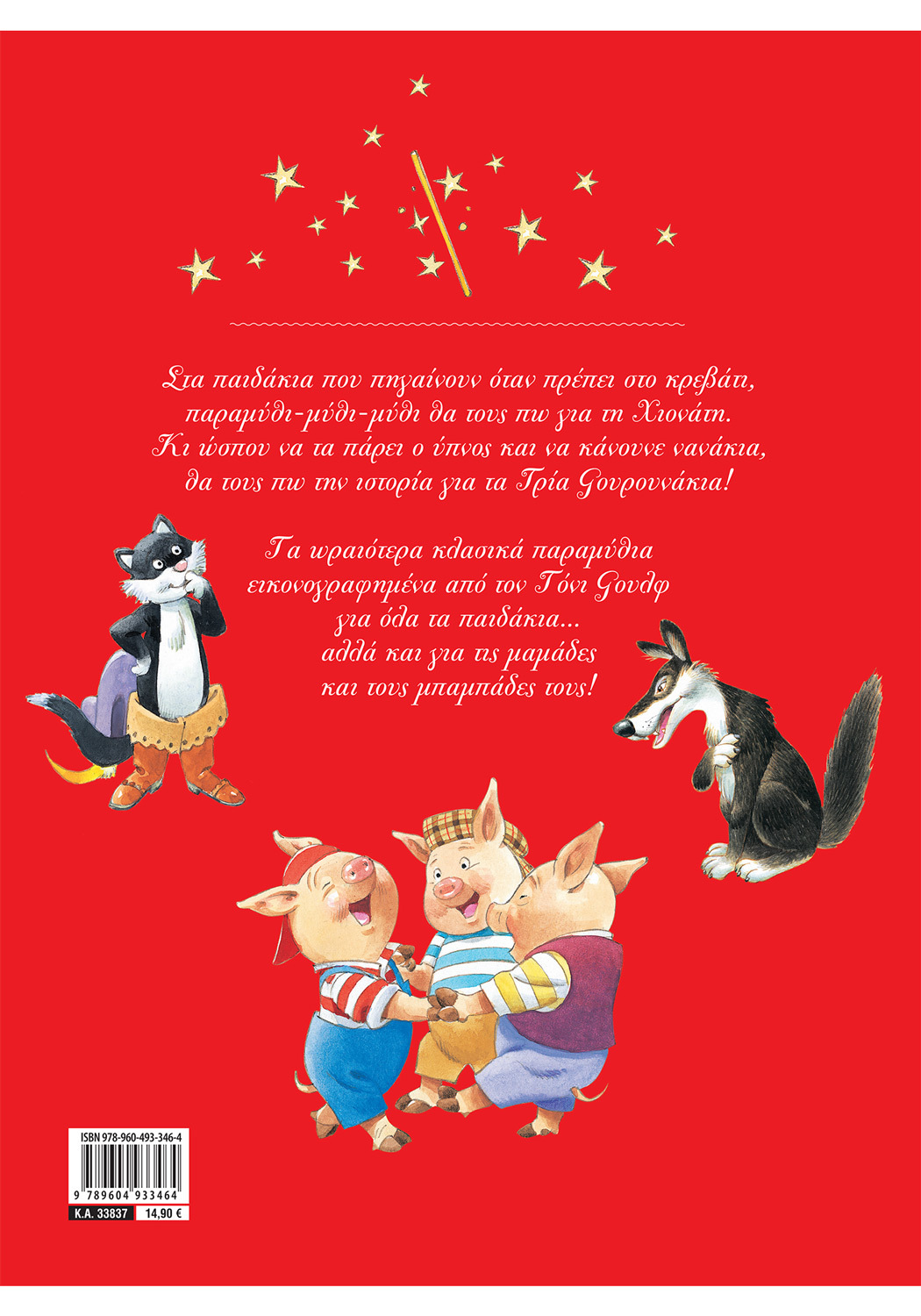 Στα παιδάκια που πηγαίνουν όταν πρέπει στο κρεβάτι, παραμύθι–μύθι-μύθι θα τους πω για τη Χιονάτη. Κι ώσπου να τα πάρει ο ύπνος και να κάνουνε νανάκια, θα τους πω την ιστορία για τα Τρία Γουρουνάκια! Τα ωραιότερα κλασικά παραμύθια εικονογραφημένα από τον Τόνι Γουλφ και με υπέροχη έμμετρη απόδοση από την Βεατρίκη Κάντζολα-Σαμπατάκου, σε μια πανέμορφη πολυτελή έκδοση. Για όλα τα παιδάκια… αλλά και για τις μαμάδες και τους μπαμπάδες τους!