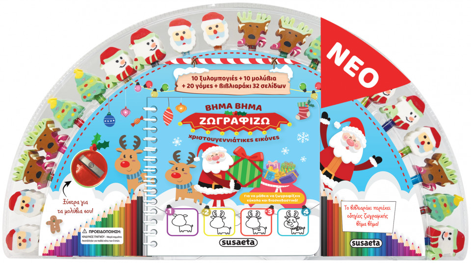 Ένα υπέροχο χριστουγεννιάτικο δώρο που περιλαμβάνει ένα βιβλίο που δείχνει στα παιδιά πώς να ζωγραφίσουν χριστουγεννιάτικες και γιορτινές εικόνες, ξυλομπογιές, μολύβια, γόμες και υπέροχες ξύστρες!