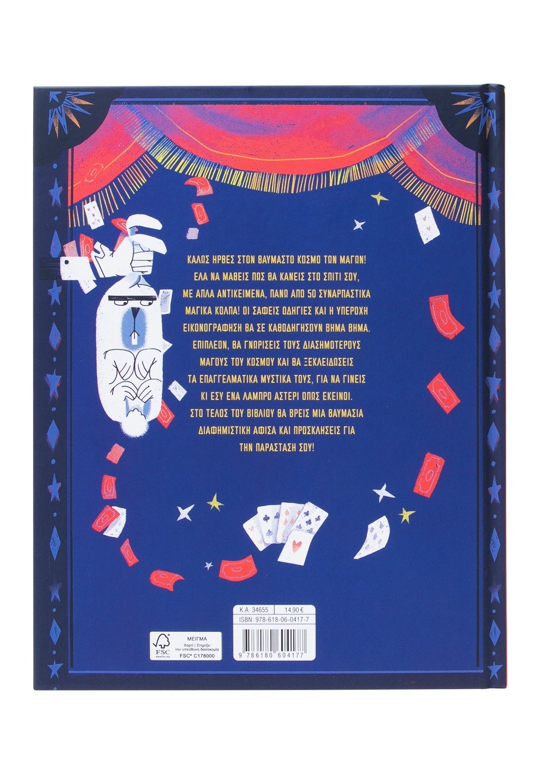 \ \Οι σαφείς οδηγίες και η υπέροχη εικονογράφηση θα σε καθοδηγήσουν βήμα βήμα. Επιπλέον, θα γνωρίσεις τους διασημότερους μάγους του κόσμου και θα ξεκλειδώσεις τα επαγγελματικά μυστικά τους, για να γίνεις κι εσύ ένα λαμπρό αστέρι όπως εκείνοι. Στο τέλος του βιβλίου θα βρεις μια θαυμάσια διαφημιστική αφίσα και προσκλήσεις για την παράστασή σου!