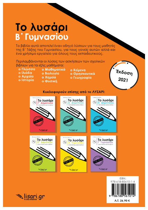 Το βιβλίο αυτό αποτελεί έναν οδηγό λύσεων για τους μαθητές της Β΄ τάξης του Γυμνασίου, για τους γονείς αυτών αλλά και ένα χρήσιμο εργαλείο για όλους τους εκπαιδευτικούς. Περιλαμβάνονται οι λύσεις των ασκήσεων των σχολικών βιβλίων για τα εξής μαθήματα: