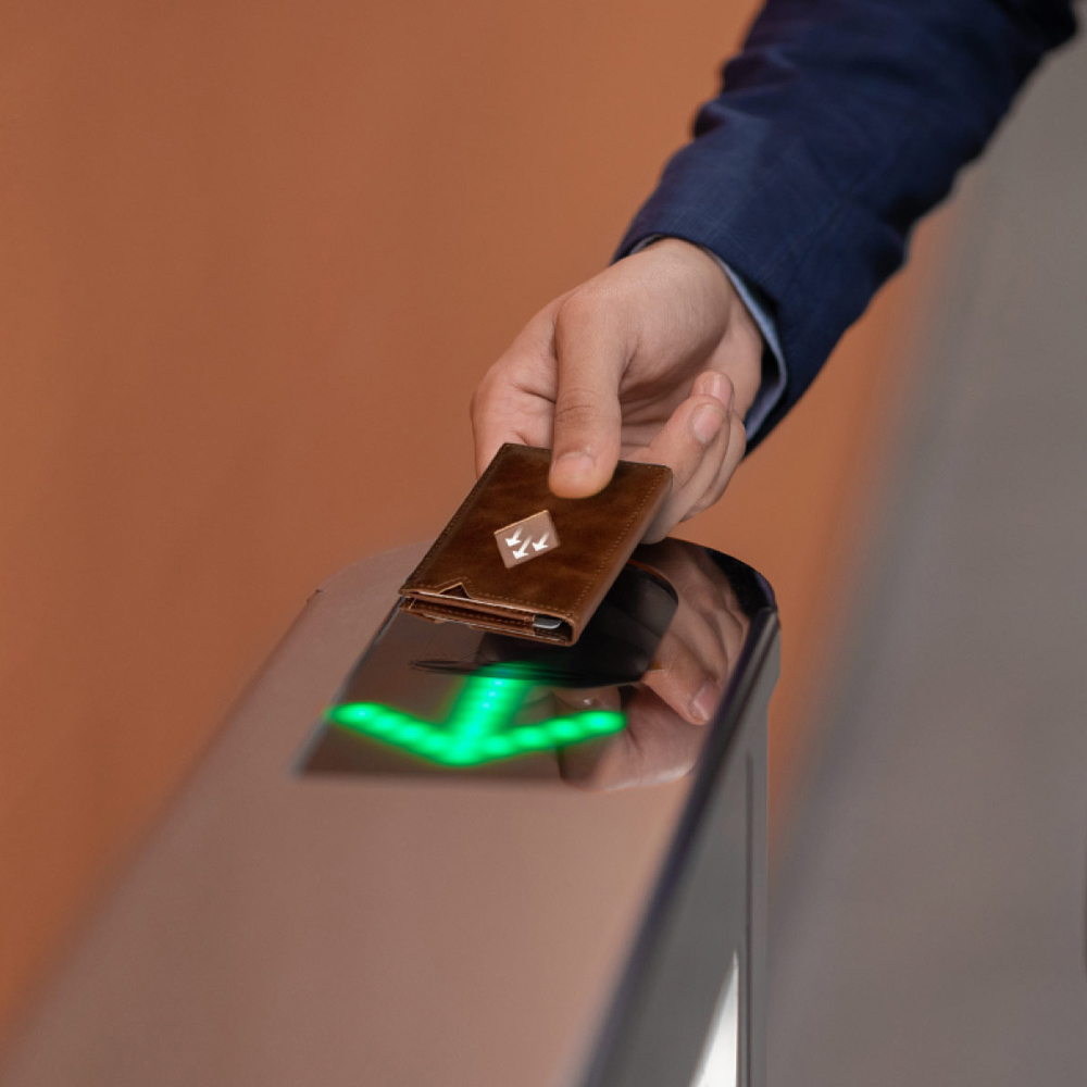 Περιέχει προστασία RFID για να διασφαλίσει ότι οι προσωπικές σας πληροφορίες και οι πιστωτικές σας κάρτες είναι ασφαλείς. Από τις έξι θήκες, οι δύο μπορούν να λειτουργήσουν ανέπαφα. Όταν το πορτοφόλι είναι κλειστό καμία κάρτα δεν λειτουργεί ανέπαφα.