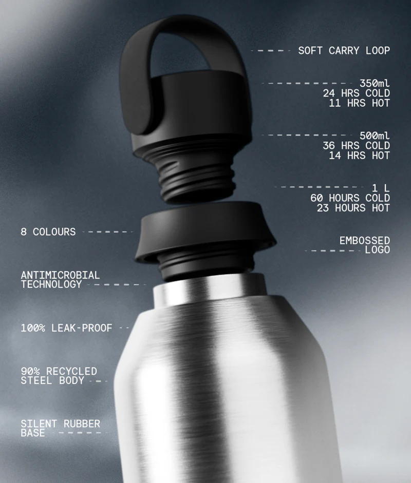 Η Series 3 συγχρονίζεται με τον ρυθμό σας. Το μπουκάλι της Σειράς 3 διαθέτει ανανεωμένο σχεδιασμό σπειρώματος που διασφαλίζει ότι το καπάκι ανοίγει ομαλά, ενώ το κολάρο παραμένει σταθερά στη θέση του. Αυτή η μικρή βελτίωση βοηθά στη διατήρηση μιας σταθερής, ανθεκτικής στις διαρροές σφράγισης, ενώ παράλληλα κάνει την καθημερινή χρήση πιο αξιόπιστη. Ένα αντιμικροβιακό κολάρο παραμένει φρέσκο μεταξύ των καθαρισμών. 100% στεγανό με αθόρυβη βάση από καουτσούκ. Κατασκευασμένο από 90% ανακυκλωμένο ανοξείδωτο ατσάλι. Και κατασκευασμένο για να διαρκεί. Βρείτε το χρώμα σας. Βρείτε τη ροή σας.