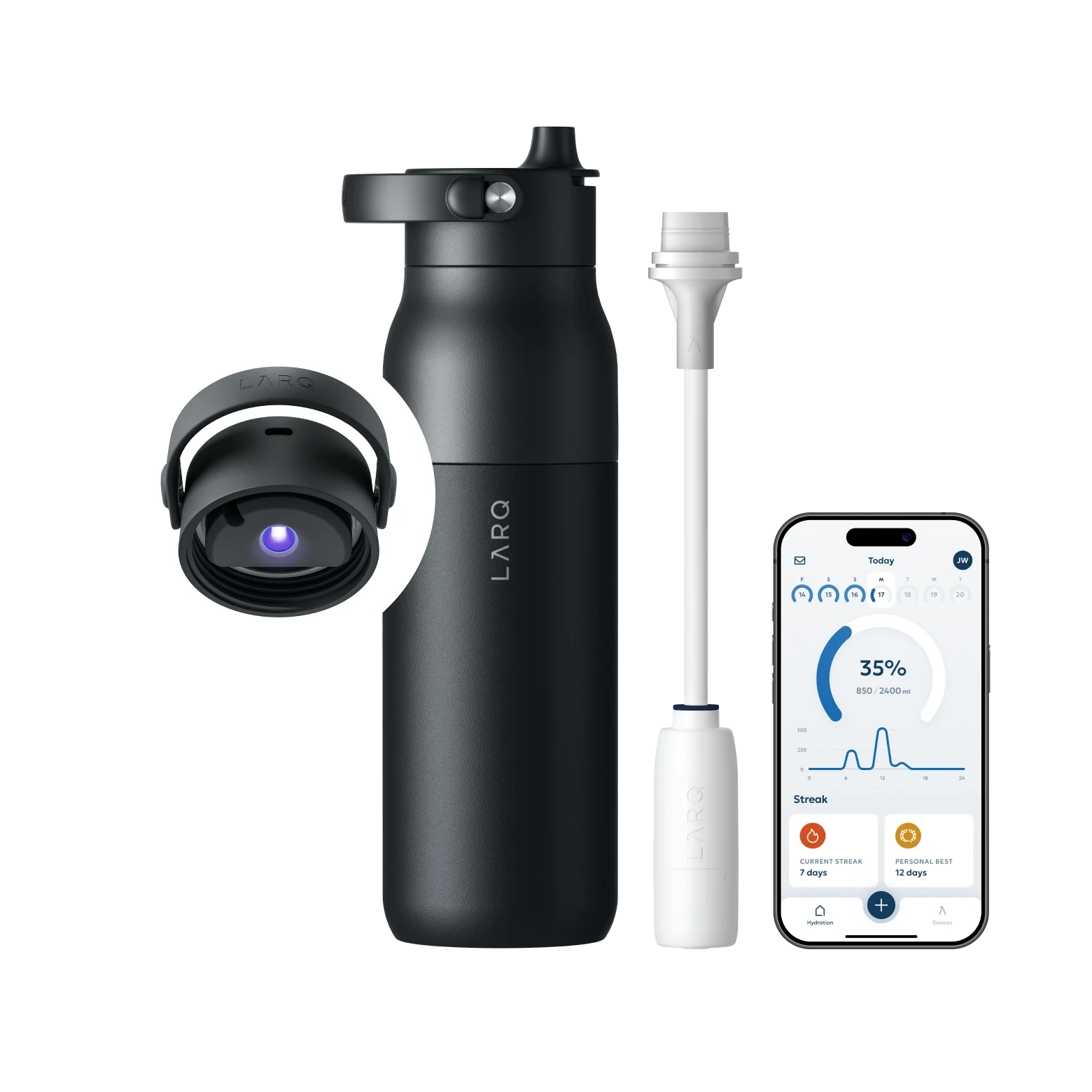 Βελτιώστε την ευεξία σας με το LARQ Bottle PureVis™ 2—το ολοκληρωμένο αυτοκαθαριζόμενο και φιλτραρισμένο μπουκάλι νερού με παρακολούθηση ενυδάτωσης για να σας βοηθήσει να πίνετε περισσότερο. Οι έξυπνοι αισθητήρες στο μπουκάλι παρακολουθούν αυτόματα κάθε γουλιά, ενώ η συνοδευτική εφαρμογή LARQ σας παρέχει πρόσβαση σε πληροφορίες και πρόοδο.