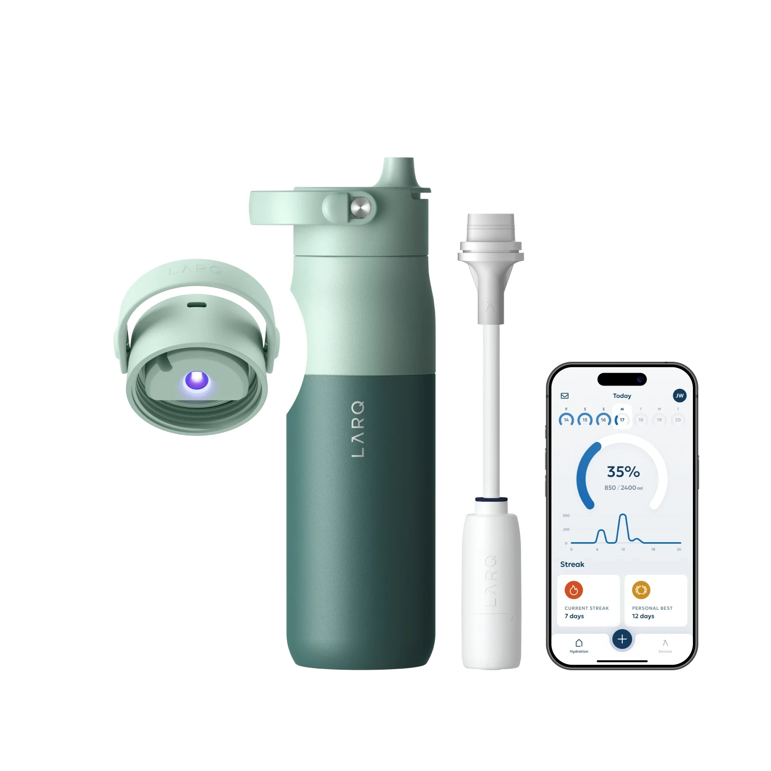 Βελτιώστε την ευεξία σας με το LARQ Bottle PureVis™ 2—το ολοκληρωμένο αυτοκαθαριζόμενο και φιλτραρισμένο μπουκάλι νερού με παρακολούθηση ενυδάτωσης για να σας βοηθήσει να πίνετε περισσότερο. Οι έξυπνοι αισθητήρες στο μπουκάλι παρακολουθούν αυτόματα κάθε γουλιά, ενώ η συνοδευτική εφαρμογή LARQ σας παρέχει πρόσβαση σε πληροφορίες και πρόοδο.