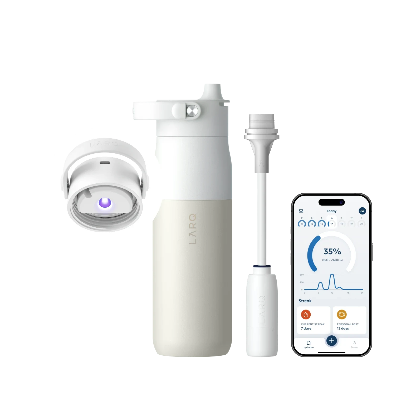 Βελτιώστε την ευεξία σας με το LARQ Bottle PureVis™ 2—το ολοκληρωμένο αυτοκαθαριζόμενο και φιλτραρισμένο μπουκάλι νερού με παρακολούθηση ενυδάτωσης για να σας βοηθήσει να πίνετε περισσότερο. Οι έξυπνοι αισθητήρες στο μπουκάλι παρακολουθούν αυτόματα κάθε γουλιά, ενώ η συνοδευτική εφαρμογή LARQ σας παρέχει πρόσβαση σε πληροφορίες και πρόοδο.
