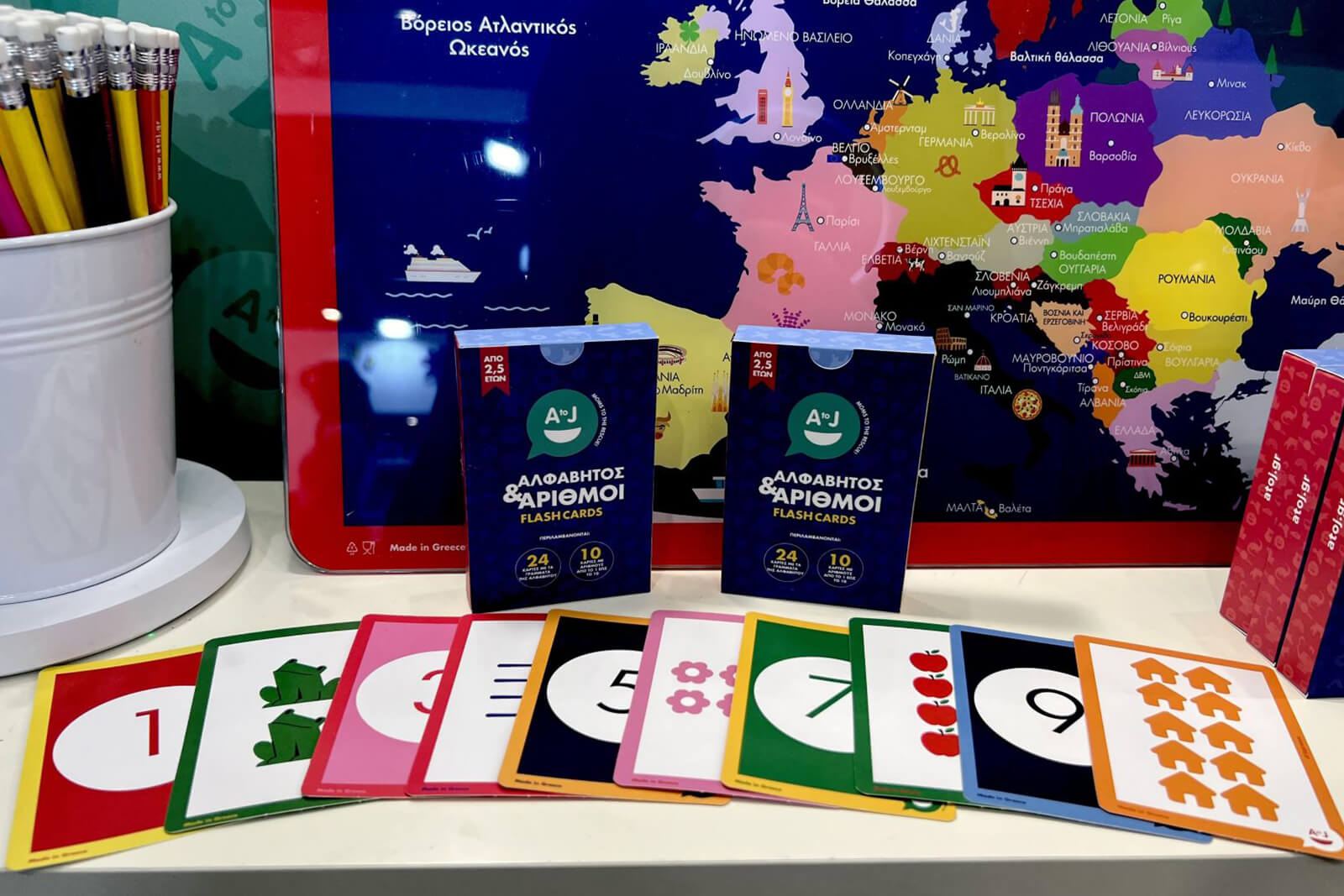 Κάθε πακέτο περιέχει 34 κάρτες: 24 κάρτες με τα γράμματα της Αλφαβήτου και 10 κάρτες με Αριθμούς από το 1 έως το 10. Στη μια όψη αποτυπώνεται το γράμμα ή ο αριθμός και στην πίσω όψη το αντίστοιχο σχέδιο, για να βοηθήσει τα παιδιά να κάνουν τη σύνδεση γράμματος – αριθμού – σχεδίου και να μάθουν παίζοντας!