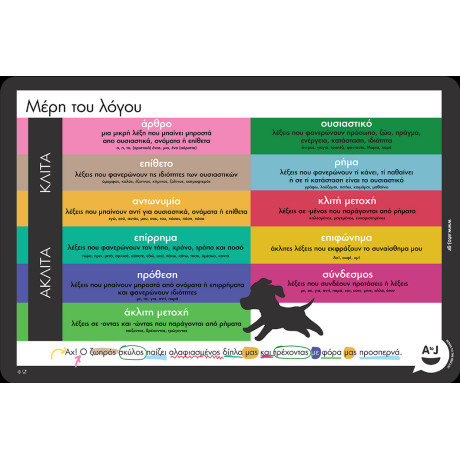 Ένα πολύχρωμο σουπλά που με ολοκληρωμένο τρόπο βοηθάει τα παιδιά στην αναγνώριση των κύριων μερών του λόγου της Ελληνικής γλώσσας. Παρουσιάζει συγκεντρωμένα και με παραδείγματα τα διαφορετικά μέρη του λόγου, ενώ μπορεί να αξιοποιηθεί και ως βοήθημα μελέτης.