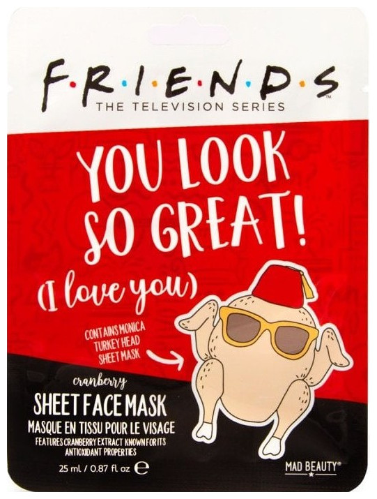 Ενυδατική μάσκα προσώπου με άρωμα cranberry και το σχέδιο της διάσημης γαλοπούλας από την εμβληματική σκηνή των F.R.I.E.N.D.S. Εμείς δεν μπορούμε να σας υποσχεθούμε το «Σ’ αγαπώ», αλλά μπορούμε να υποσχεθούμε μια λαμπερή και αναζωογονημένη επιδερμίδα.