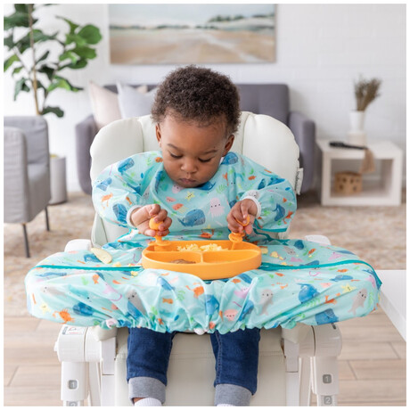 Η Tray Mat σαλιάρα αποτελεί μια καινοτόμο λύση της Bumkins παρέχοντας πλήρη κάλυψη στα παιδιά, που τρώνε ακατάστατα. Κατασκευασμένη από αδιάβροχο ύφασμα με την υπογραφή της εταιρείας, η σαλιάρα αυτή καλύπτει τόσο το μωρό όσο και το καρεκλάκι φαγητού χάρη στο γενικό κάλυμμα, που προσαρμόζεται πάνω στο δίσκο με το κορδόνι περίσφιξης! Καθώς το μωρό μεγαλώνει και χρειάζεται μικρότερη κάλυψη, μπορείτε εύκολα να αφαιρέσετε το κάλυμμα με το φερμουάρ, μετατρέποντας την Tray Mat σε κανονική σαλιάρα με μανίκια με ελαστικές μανσέτες και τσέπη.
