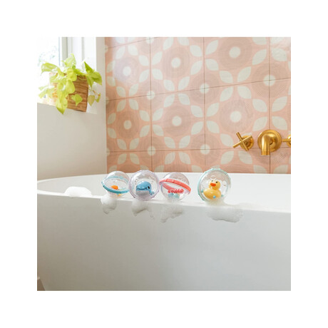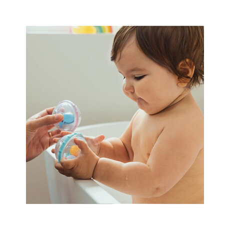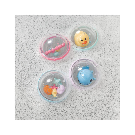 "Στο μωρό σας αρέσουν τα πράγματα που κουδουνίζουν, χοροπηδούν, περιστρέφονται και λάμπουν; Τότε θα λατρέψουν σίγουρα τις μπουρμπουλήθρες Float & Play Bath Bubbles! Όλες οι μπουρμπουλήθρες επιπλέουν και περιέχουν ένα παιχνίδι που κουδουνίζει, χοροπηδά, λάμπει και περιστρέφεται. Έχουν κατάλληλο μέγεθος για μικρά χεράκια και βοηθούν στον συντονισμό των χεριών με τα μάτια, ώστε το μωρό να μάθει να φτάνει, να πιάνει και να κουνάει τις μπουρμπουλήθρες. Χρωματιστοί δακτύλιοι κινούνται ελεύθερα γύρω από τις μπουρμπουλήθρες, προσφέροντας πολλές διαφορετικές υφές και κινήσεις για να εξερευνήσει το μωρό σας. Με τις μπουρμπουλήθρες Float & Play Bubbles, το μπάνιο μετατρέπεται σε απόλαυση! Όλες οι συσκευασίες δύο τεμαχίων περιέχουν (1) διασκεδαστική φιγούρα και (1) παιχνίδι που περιστρέφεται ή κουδουνίζει.