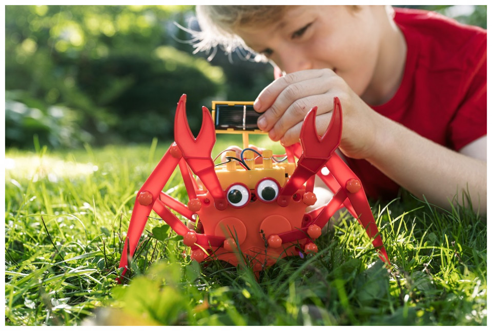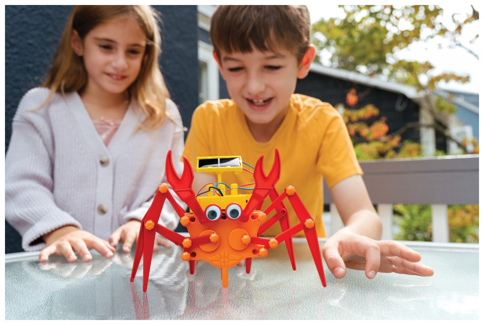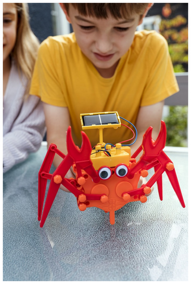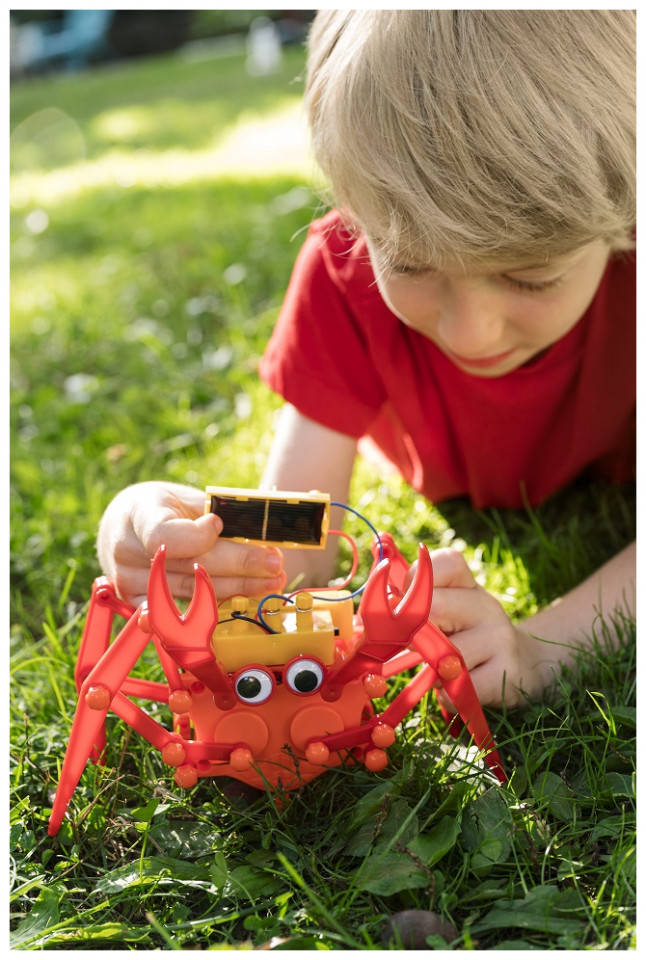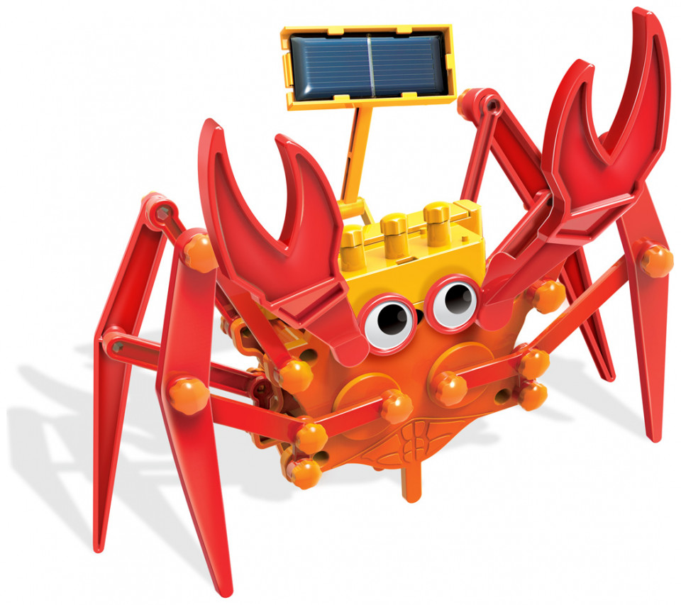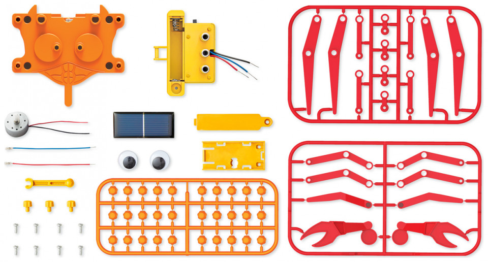 ΠΕΡΙΕΧΟΜΕΝΑ: Τμήμα A: Σώμα ρομπότ, Τμήμα Β: Κάλυμμα μοτέρ, Τμήμα Γ: Θήκη μπαταρίας, Τμήμα Δ: Τμήμα συγκράτησης ηλιακού πάνελ, Τμήμα Ε: Ηλιακό πάνελ, Τμήμα ΣΤ: Κάλυμμα μπαταρίας, Τμήμα Ζ: Μοτέρ, Τμήμα H: Δεξί πόδι x 2, Τμήμα Θ: Μεγάλη σύνδεση x 4, Τμήμα Ι: Κοντή σύνδεση x 4, Τμήμα K: Αριστερό πόδι x 2, Τμήμα Λ: Αριστερή δαγκάνα, Τμήμα M: Δεξιά δαγκάνα, Τμήμα Ν: Αριστερή σύνδεση x 2, Τμήμα Ξ: Δεξιά σύνδεση x 2, Τμήμα Ο: Αριστερό οπίσθιο πόδι, Τμήμα Π: Δεξιό οπίσθιο πόδι, Τμήμα Ρ: συνδέσμους στερέωσης x 30, Τμήμα Σ: Κινούμενο μάτι x 2, Τμήμα T: Ζεύγη καλωδίων, Τμήμα Υ: Βραχίονας στήριξης, Τμήμα Φ: Βίδα x 4, και Τμήμα Χ: Καπάκια ακροδέκτη x 3.