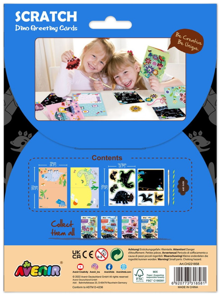 Οι ευχετήριες κάρτες της Avenir Scratch είναι ένας χαριτωμένος τρόπος τα παιδιά να εκφράσουν την αγάπη και τις ευχές τους στα αγαπημένα τους πρόσωπα σε γιορτές και σε κάθε είδους περίσταση επιθυμούν. Χαρίστε τους τη δυνατότητα να φτιάξουν υπέροχες κάρτες με φαντασία και δημιουργικότητα προς τέρψη αυτών που τις λαμβάνουν!
