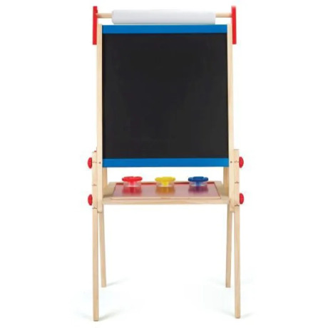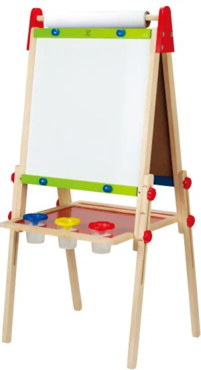Περιλαμβάνει: 3 δοχεία χρωμάτων, διπλής όψης καβαλέτο με μαυροπίνακα και μαγνητικό πίνακα και ρολό χαρτί.