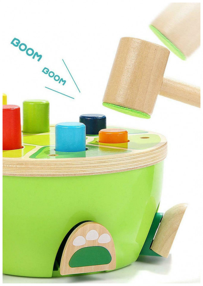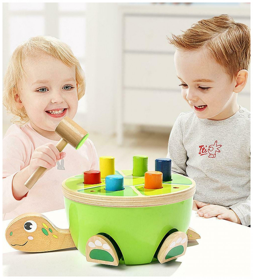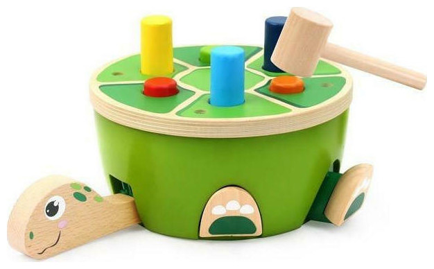 Καθώς το παιδί χτυπάει μία σφήνα με το σφυρί, βλέπει το κεφάλι της χελώνας να βγαίνει προς τα έξω κι όταν χτυπήσει σε άλλη σφήνα να μαζεύεται κάτω από το καύκαλό της. Το ίδιο συμβαίνει με τα πόδια της. Οι σφήνες δεν αποσπώνται από το παιχνίδι για μεγαλύτερη ασφάλεια. Παιχνίδι υψηλής ποιότητας από ξύλο και πλαστικό. Το σφυρί διαθέτει μαξιλαράκι για να μειωθεί ο θόρυβος. Παιχνίδι που ασκεί την λεπτή κινητικότητα του παιδιού και προκαλεί την περιέργειά του.