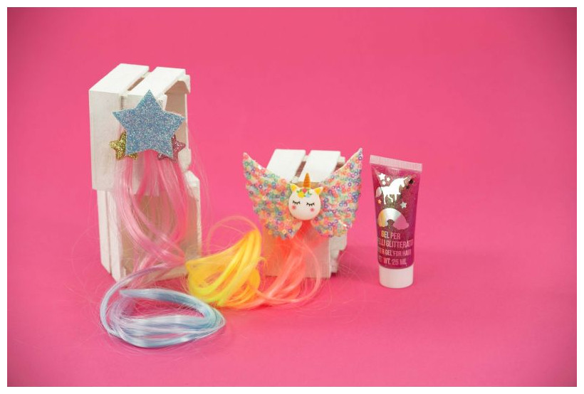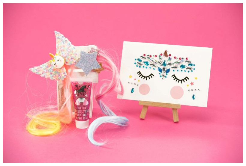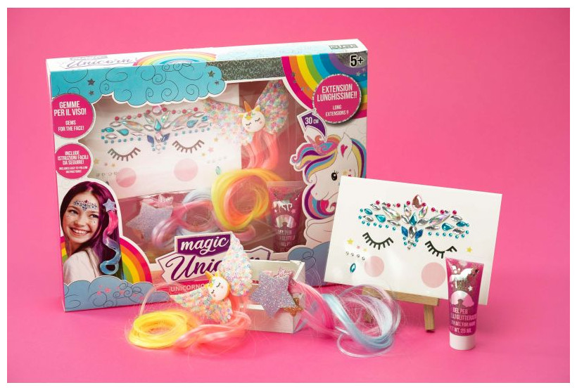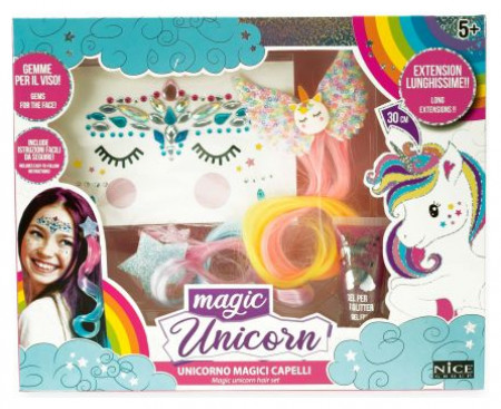 Ενέργεια, χάρη, δύναμη και μυστήριο: το να είσαι Μονόκερος είναι απλά υπέροχο! Τώρα μπορείτε και εσείς να αναπτύξετε το δικό σας στυλ Unicorn, σύμβολο δημιουργικότητας και φαντασία! Περιλαμβάνει: ένα ζευγάρι πολύχρωμα extension μαλλιών, πολύτιμους λίθους για το πρόσωπο και λαμπερά μαλλιά gel, όλα κατάλληλα για το ευαίσθητο δέρμα των παιδιών