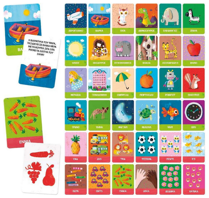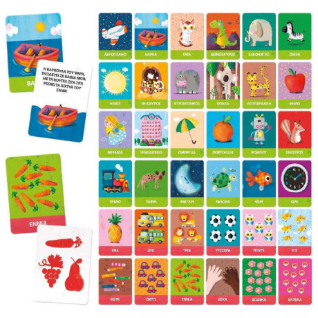 36 μεγάλες κάρτες, για διάφορες προοδευτικές εκπαιδευτικές δραστηριότητες που συνηθίζουν τα παιδιά στο να παρατηρούν και να αναγνωρίζουν πολλές λέξεις.