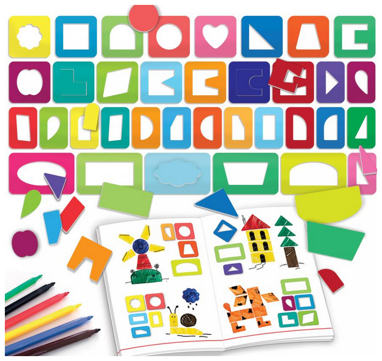 Πολλές ιδέες για σχέδιο και χρώμα. Περιέχει πολλά στένσιλ που τα παιδιά μπορούν να χρησιμοποιήσουν για τη δημιουργία διαφορετικών χαρακτήρων, συνδυάζοντας χρώματα κιαι σχήματα. Με αυτό τον τρόπο, τα παιδιά αναπτύσσουν τη φαντασία τους και τη λεπτή κινητικότητα.