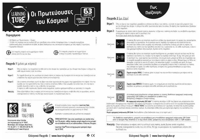 - 1 Κύβο που περιέχει και τον κωδικό QR για πρόσβαση στην online πλατφόρμα όπου το παιχνίδι συνεχίζεται διαδικτυακά μέσω smartphone & tablet, σε βάση δεδομένων που ανανεώνεται διαρκώς με νέες κάρτες / ερωτήσεις