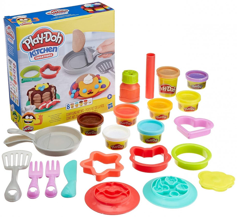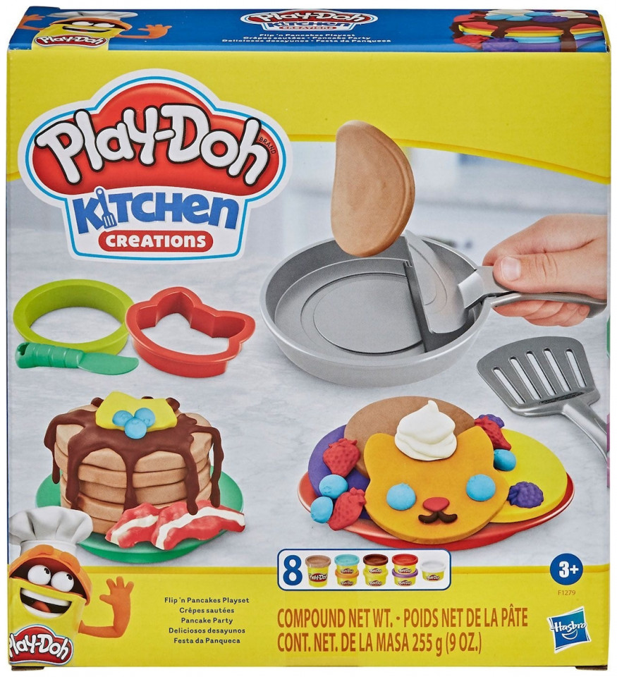 Εξάψτε τη φαντασία των μικρών σεφ με το Play-Doh Flip 'n Pancakes! Το τηγάνι σε αυτό το σετ πρωινού Play-Doh πραγματικά αναποδογυρίζει τις τηγανίτες σας στον αέρα με το πάτημα ενός κουμπιού. Φτιάξτε τηγανίτες Play-Doh σε 4 διαφορετικά χρώματα (μη τοξικά) και μετά αναποδογυρίστε τις, στοιβάξτε τις στα πιάτα και γαρνίρετέ τις με σιρόπι! Προσθέστε αυτό το σετ στη συλλογή σας με παιχνίδια Play-Doh Kitchen Creations