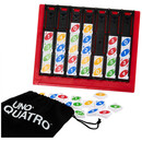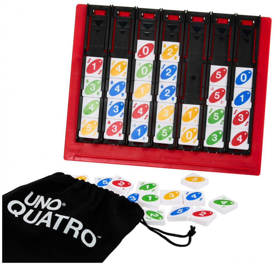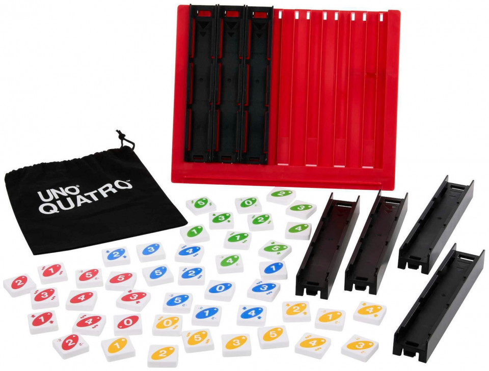 Οι φίλοι των παιχνιδιών με κάρτες UNO θα λατρέψουν το οικογενειακό παιχνίδι UNO Quatro. Συνδυάζει την ικανότητα αντιστοίχισης χρωμάτων και αριθμών με την πρόκληση να πετύχετε τέσσερα στη σειρά, ενώ ταυτόχρονα προσπαθείτε να βρείτε ένα κατάλληλο χρώμα ή αριθμό. Όταν έρθει η σειρά του κάθε παίχτη, τοποθετούν τα πλακίδια τους σε ένα από τα 7 διαμερίσματα-ταμπλό παιχνιδιού και προσπαθούν να τοποθετήσουν στρατηγικά τα πλακίδια για να σχηματίσουν τέσσερα στη σειρά. Τέσσερα στη σειρά μπορούν να επιτευχθούν είτε διαγώνια, κάθετα ή οριζόντια.