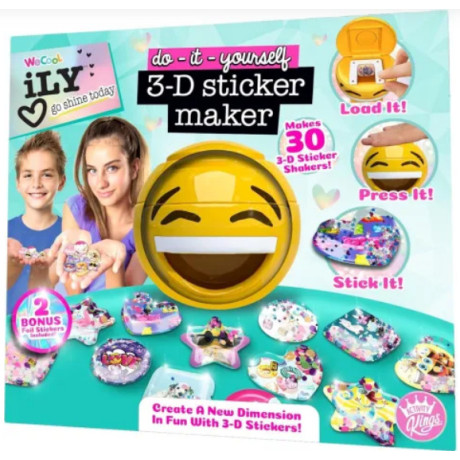 WT Ily Go Shine Today 3D Sticker Maker (112665). Δημιουργήστε μια νέα διάσταση διασκέδασης με τρισδιάστατα αυτοκόλλητα με το iLY DIY 3-D Sticker Maker. Εξατομικεύστε τα τρισδιάστατα αυτοκόλλητά σας με απίθανα πασπαλίσματα, γκλίτερ και πολύτιμους λίθους. Διακοσμήστε το τετράδιο, το ημερολόγιο και τις κάρτες σας με τις δημιουργίες σας. Ιδανικό για να το μοιραστείτε με τους φίλους σας. Περιλαμβάνει:
