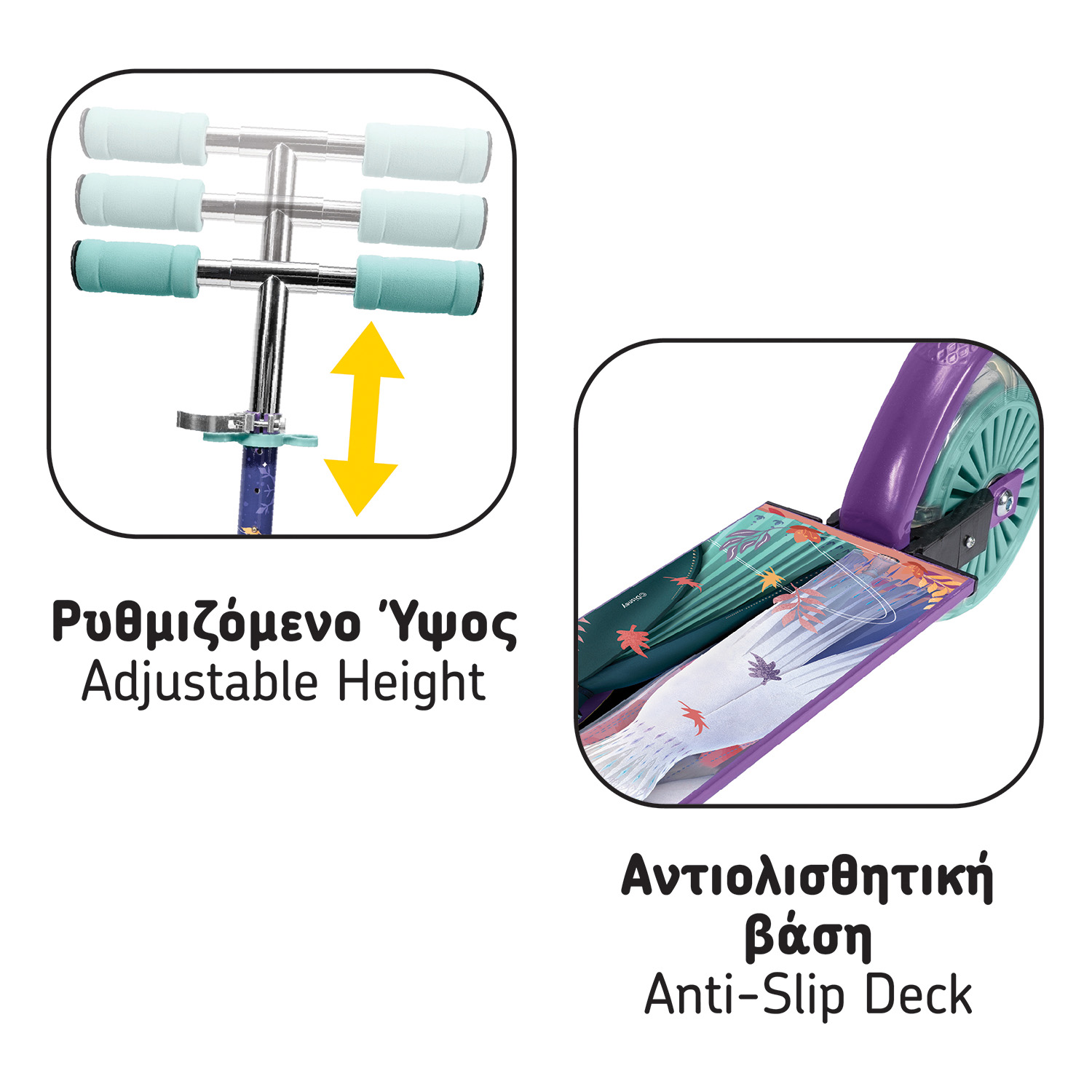 Το AS Πατίνι Frozen με Φωτιζόμενες Ρόδες είναι η ιδανική επιλογή για μικρές φίλες της αγαπημένης ηρωίδας Frozen που θέλουν να απολαμβάνουν βόλτες με ασφάλεια και στυλ. Διαθέτει φωτιζόμενες ρόδες που χαρίζουν εντυπωσιακό αποτέλεσμα σε κάθε κίνηση, αντιολισθητική βάση για μεγαλύτερη σταθερότητα, φρένο για ασφαλή χρήση και ρυθμιζόμενο τιμόνι που προσαρμόζεται στο ύψος του παιδιού. Είναι κατάλληλο για παιδιά 5+ ετών και βάρος έως 50 κιλά, προσφέροντας διασκέδαση, άνεση και αυτοπεποίθηση σε κάθε διαδρομή.