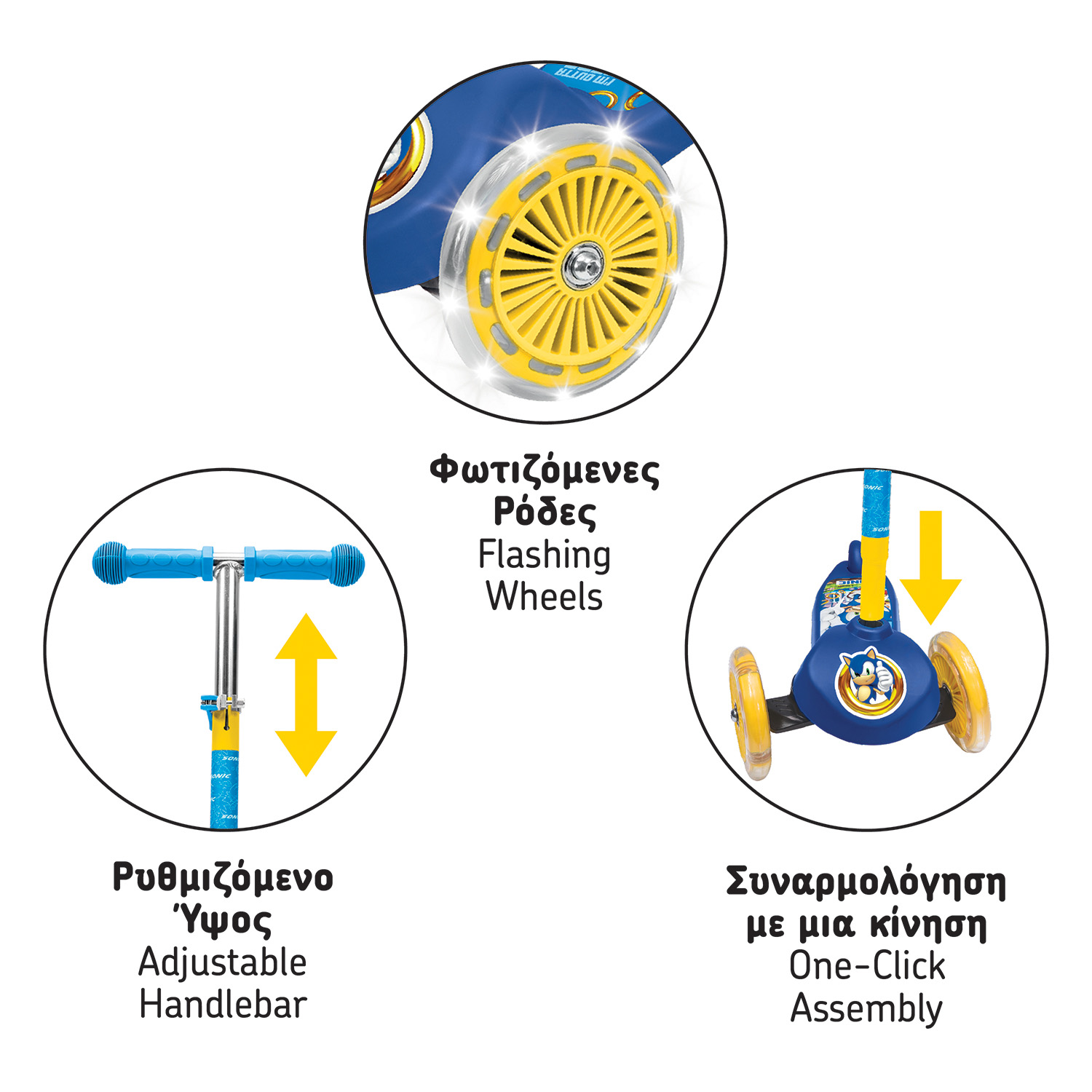 Το AS Scooter Plus Sonic με φωτιζόμενες ρόδες είναι ένα ασφαλές και διασκεδαστικό scooter για νεαρούς θαυμαστές του Sonic. Με 3 ρόδες για καλύτερη ισορροπία, ρυθμιζόμενο τιμόνι και αντιολισθητική βάση, προσφέρει άνεση και σιγουριά σε κάθε βόλτα. Οι φωτιζόμενες ρόδες χαρίζουν εντυπωσιακό θέαμα και ενθαρρύνουν το παιδί να βγει έξω για παιχνίδι και κίνηση. Ιδανικό για ηλικίες 3+ Ετών, συνδυάζει παιχνίδι και ασφάλεια σε ένα προϊόν με τον αγαπημένο ήρωα τους.