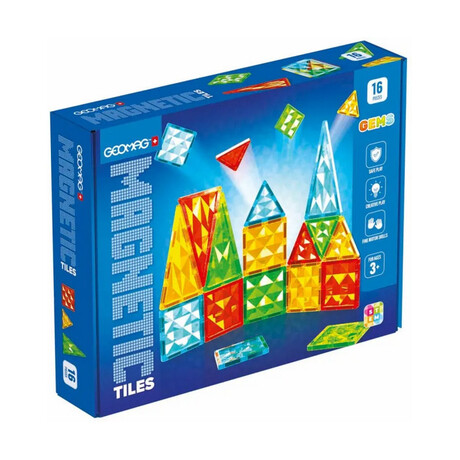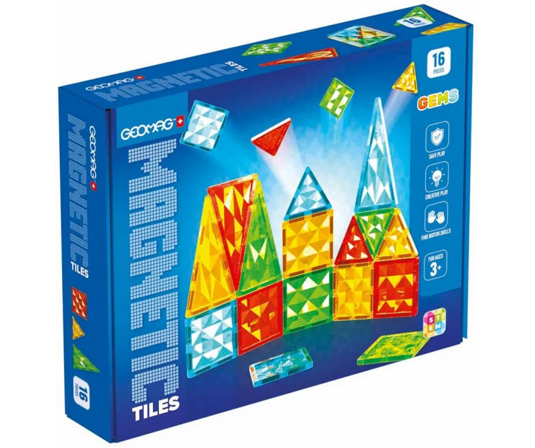 Geomag Magnetic Tiles Gems 16pcs. (PF.224.100.00). Τα μαγνητικά πλακίδια Geomag® Gems είναι κατάλληλα για την κατασκευή δημιουργικών 2D και 3D αντικειμένων - οι μαγνητικές δυνάμεις στα πλακίδια συγκρατούν αξιόπιστα κάθε μοντέλο μαζί Τα μαγνητικά πλακίδια Gems κάνουν τη μάθηση διασκεδαστική - ενθαρρύνοντας την κατανόηση γεωμετρικών εννοιών, τις δεξιότητες STEM, την ομαδική εργασία, τη δημιουργικότητα, τη συναισθηματική νοημοσύνη και τις λεπτές κινητικές δεξιότητες Με τα πλακίδια, τα παιδιά μπορούν να μάθουν τα σχήματα, τα χρώματα και τις βασικές οικοδομικές δεξιότητες μέσα από το παιχνίδι από μικρή ηλικία και να στοιβάζουν, να κατασκευάζουν και να εξερευνούν με την ψυχή τους Εξαιρετικά ανθεκτικά για χρόνια διασκέδασης στο παιχνίδι Όλα τα σετ μπορούν να συνδυαστούν μεταξύ τους - για απόλυτη διασκέδαση δημιουργικού παιχνιδιού! Εύκολο στη χρήση και ιδανικό για μικρά χεράκια - τα μαγνητικά πλακίδια είναι κατάλληλα για παιδιά ηλικίας 3 ετών και άνω Περιεχόμενα: 8 x τετράγωνα, 4 x ισόπλευρα τρίγωνα, 4 x μακρόστενα ισοσκελή τρίγωνα Όλα τα μέρη σε 4 διαφορετικά χρώματα (κόκκινο, πορτοκαλί, πράσινο, μπλε) Περιλαμβάνονται οδηγίες.