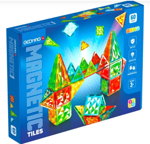 Geomag Magnetic Tiles Gems 60pcs. (PF.224.103.00). Τα μαγνητικά πλακίδια Geomag® Gems είναι κατάλληλα για την κατασκευή δημιουργικών 2D και 3D αντικειμένων - οι μαγνητικές δυνάμεις στα πλακίδια συγκρατούν αξιόπιστα κάθε μοντέλο μαζί. Τα μαγνητικά πλακίδια Gems κάνουν τη μάθηση διασκεδαστική - ενθαρρύνοντας την κατανόηση γεωμετρικών εννοιών, τις δεξιότητες STEM, την ομαδική εργασία, τη δημιουργικότητα, τη συναισθηματική νοημοσύνη και τις λεπτές κινητικές δεξιότητες. Με τα πλακίδια, τα παιδιά μπορούν να μάθουν τα σχήματα, τα χρώματα και τις βασικές οικοδομικές δεξιότητες μέσα από το παιχνίδι από μικρή ηλικία και να στοιβάζουν, να κατασκευάζουν και να εξερευνούν με την ψυχή τους. Όλα τα σετ μπορούν να συνδυαστούν μεταξύ τους - για απόλυτη διασκέδαση δημιουργικού παιχνιδιού! Εύκολο στη χρήση και ιδανικό για μικρά χεράκια - τα μαγνητικά πλακίδια είναι κατάλληλα για παιδιά ηλικίας 3 ετών και άνω! Περιεχόμενα: