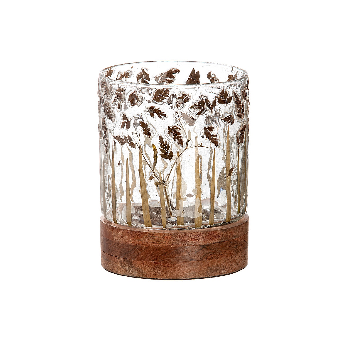 Κηροπήγιο ArteLibre Με Διακόσμηση Φύλλα Διάφανο/Καφέ Γυαλί/Ξύλο 13.5cm