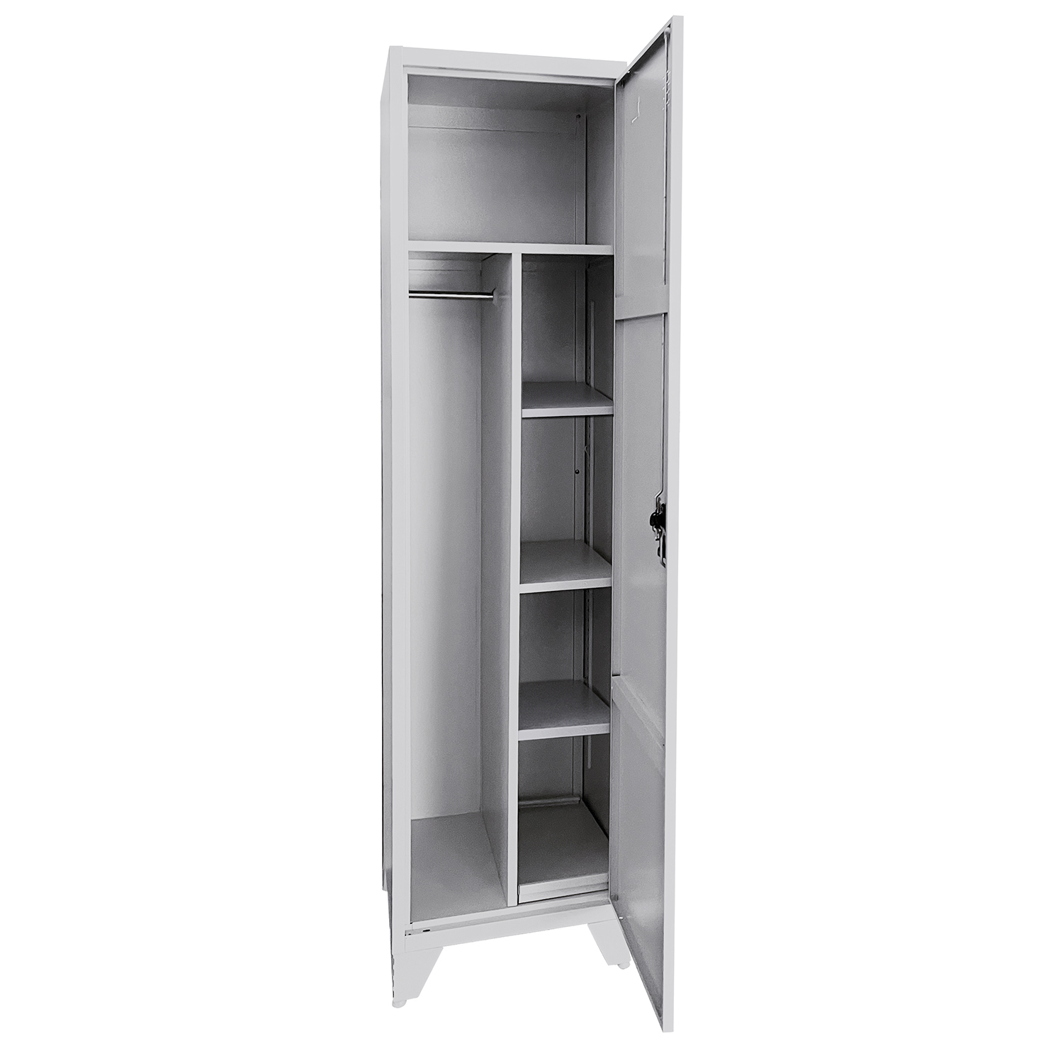 - Το χώρισμα στο κέντρο της ντουλάπας δημιουργεί 3 χώρους, ένα μεγάλο με δοκάρι για κρέμαση ρούχων, 1 πατάρι και 4 ρυθμιζόμενα ράφια στη δεξιά πλευρά
