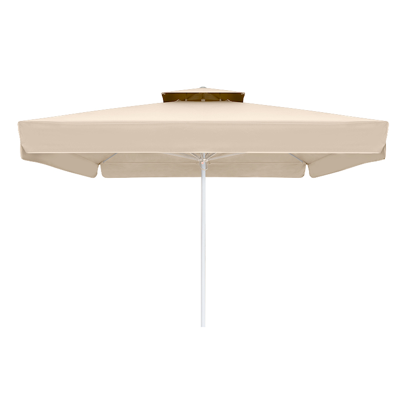 Τετράγωνη ομπρέλα αλουμινίου με τηλεσκοπικό μηχανισμό και διπλό αεραγωγό που επιτρέπει την κυκλοφορία του αέρα μειώνοντας ταυτόχρονα την πίεση του. Ιδανική επιλογή για επαγγελματική χρήση όπως beach bars, πισίνες και χώρους εστίασης.