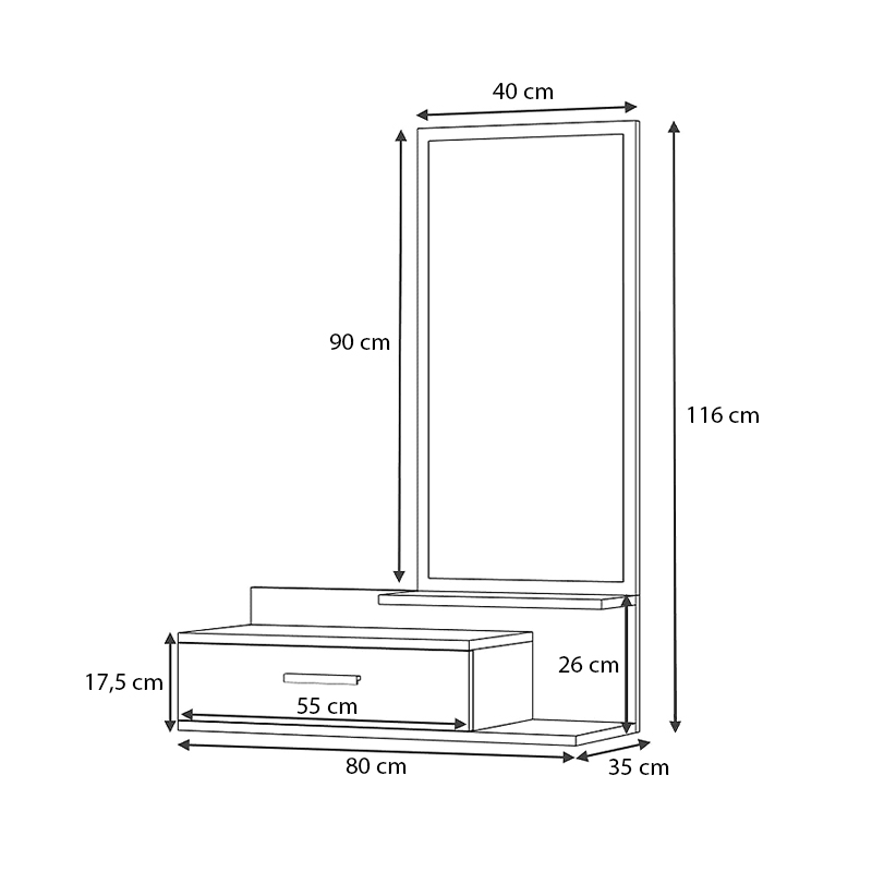 - Φέρει δύο ράφια, ένα συρτάρι και καθρέφτη.