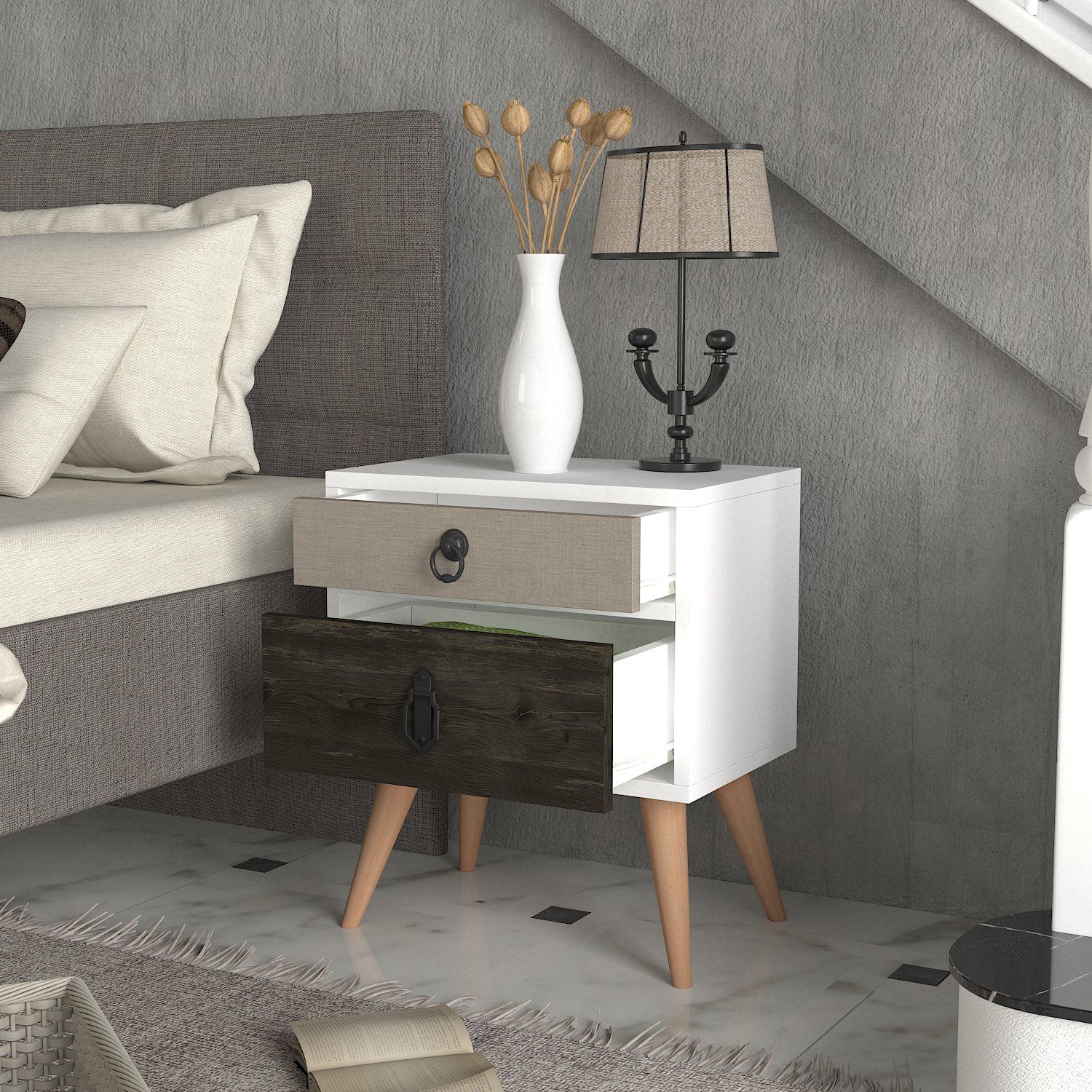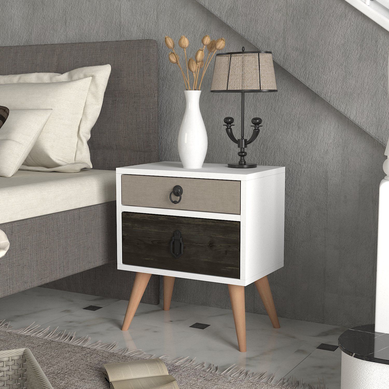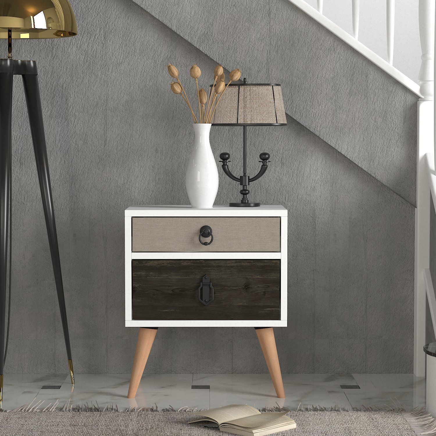 Κομοδίνο ArteLibre KIMOLOS Λευκό/Φυσικό/Καφέ 45x30x52cm