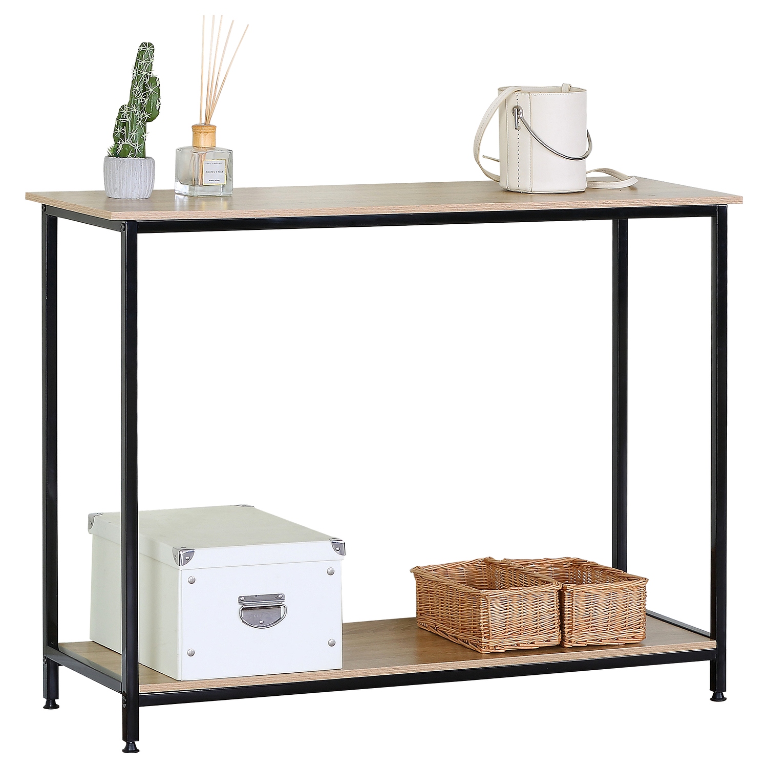 - Φινίρισμα δρυός και μαύρο μεταλλικό πλαίσιο
