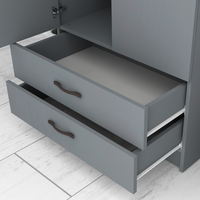 - Στο εσωτερικό της φέρει μια μεταλλική βέργα για κρεμάστρες. Στο κάτω μέρος φέρει δύο πρακτικά συρόμενα συρτάρια.