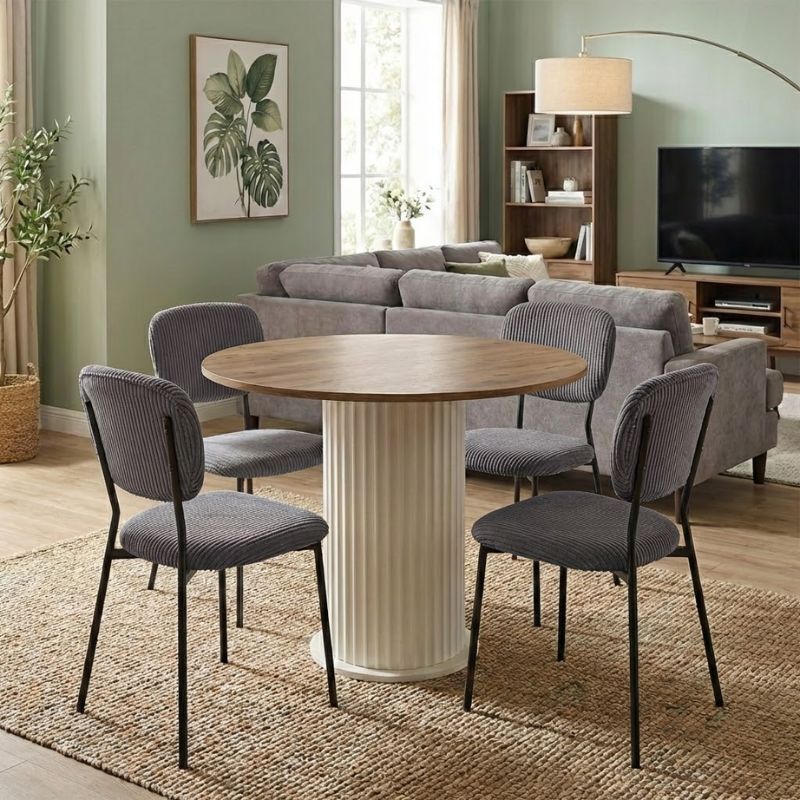 Η τραπεζαρία Bohema - Kevin θα φέρει μία αίσθηση εκλεπτυσμένης κομψότητας στον χώρο σας. Το πλούσιο κοτλέ ύφασμα της καρέκλας χαρίζει ζεστασιά και υφή, ενώ τα μεταλλικά πόδια προσδίδουν μοντέρνο χαρακτήρα και σταθερότητα. Ιδανική επιλογή τόσο για το σπίτι όσο και για επαγγελματικούς χώρους που θέλουν να επικοινωνήσουν ποιότητα και design σε κάθε λεπτομέρεια.