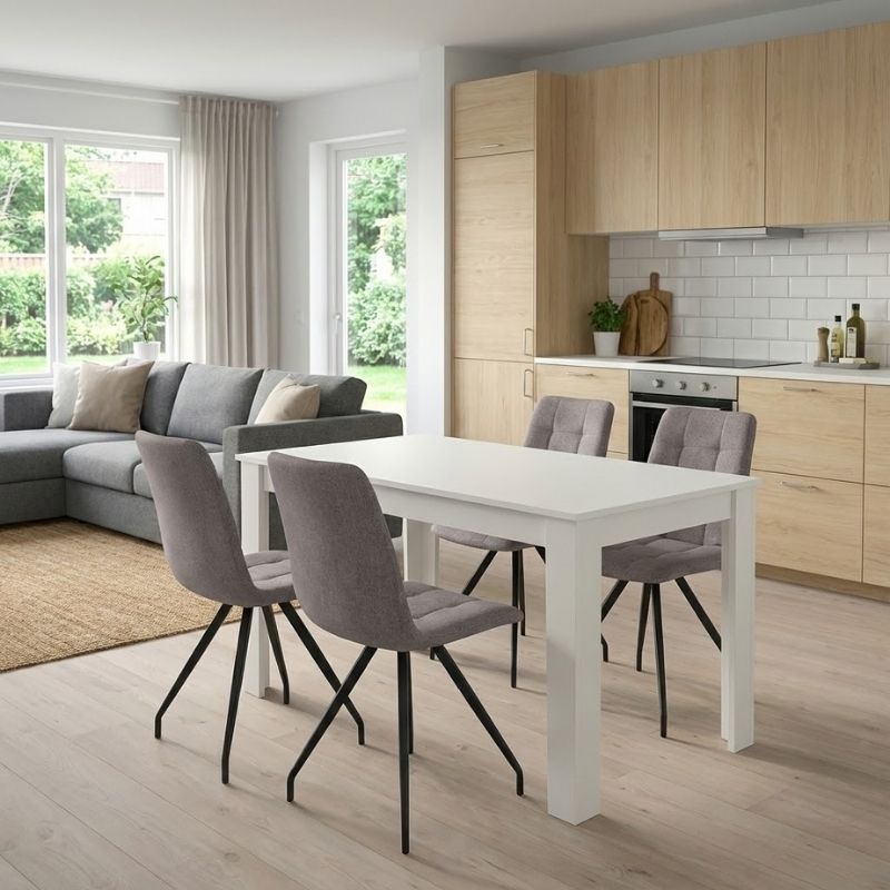 Η τραπεζαρία Darlen - Bianca θα προσθέσει μοντέρνα κομψότητα και άνεση σε κάθε χώρο. Το απαλό ύφασμα της καρέκλας προσφέρει αισθητική άνεσης, ενώ τα στιβαρά, μαύρα μεταλλικά πόδια προσδίδουν μοντέρνα και σταθερή δομή. Είναι ιδανική για την τραπεζαρία ενός μοντέρνου σπιτιού, αλλά και για επαγγελματικούς χώρους όπως καφέ, εστιατόρια ή AirBnB - όπου η λεπτομέρεια και η αισθητική κάνουν τη διαφορά.