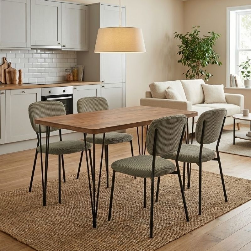 Η τραπεζαρία Roger - Kevin θα φέρει μία αίσθηση εκλεπτυσμένης κομψότητας στον χώρο σας. Το πλούσιο κοτλέ ύφασμα της καρέκλας χαρίζει ζεστασιά και υφή, ενώ τα μαύρα μεταλλικά πόδια προσδίδουν μοντέρνο χαρακτήρα και σταθερότητα. Ιδανική επιλογή τόσο για το σπίτι όσο και για επαγγελματικούς χώρους που θέλουν να επικοινωνήσουν ποιότητα και design σε κάθε λεπτομέρεια.