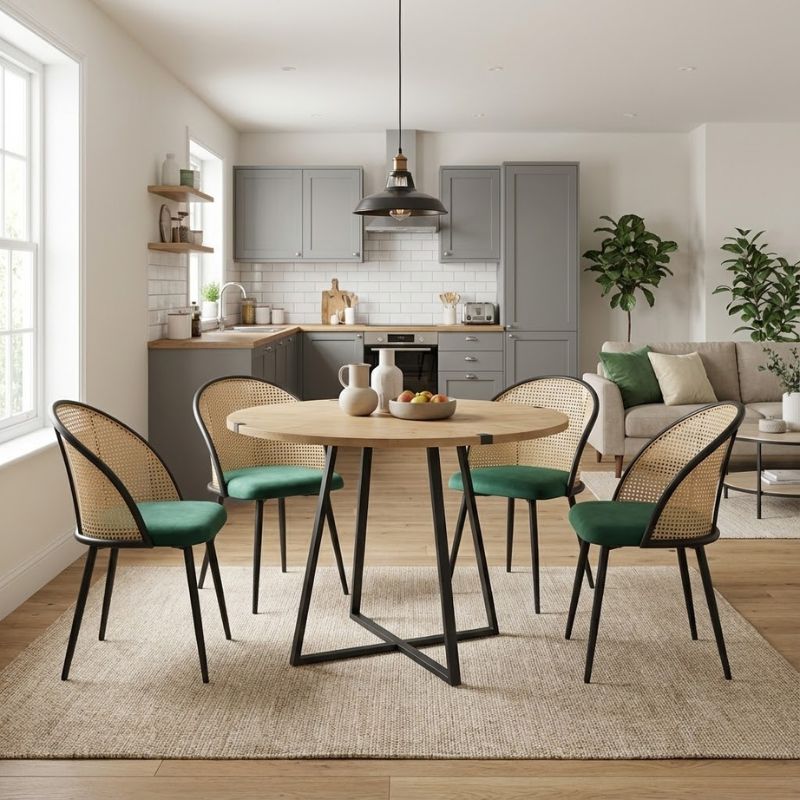 Η τραπεζαρία Rubes - Jacob συνδυάζει την πλούσια υφή του βελούδου της καρέκλας με τη στιβαρότητα του μεταλλικού σκελετού, δημιουργώντας μια ιδανική ισορροπία ανάμεσα στην αισθητική και τη λειτουργικότητα. Η εντυπωσιακή πλάτη από PE rattan προσδίδει κομψότητα και χαρακτήρα στον χώρο. Αποτελεί ιδανική επιλογή τόσο για τη τραπεζαρία ενός μοντέρνου σπιτιού όσο και για επαγγελματικούς χώρους, όπως καφέ, εστιατόρια ή Airbnb, όπου η λεπτομέρεια και το design κάνουν τη διαφορά.