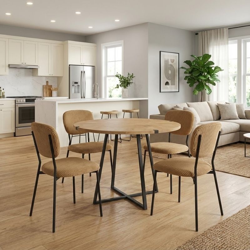 Η τραπεζαρία Rubes - Kevin θα φέρει μία αίσθηση εκλεπτυσμένης κομψότητας στον χώρο σας. Το πλούσιο κοτλέ ύφασμα της καρέκλας χαρίζει ζεστασιά και υφή, ενώ τα μεταλλικά πόδια προσδίδουν μοντέρνο χαρακτήρα και σταθερότητα. Ιδανική επιλογή τόσο για το σπίτι όσο και για επαγγελματικούς χώρους που θέλουν να επικοινωνήσουν ποιότητα και design σε κάθε λεπτομέρεια.
