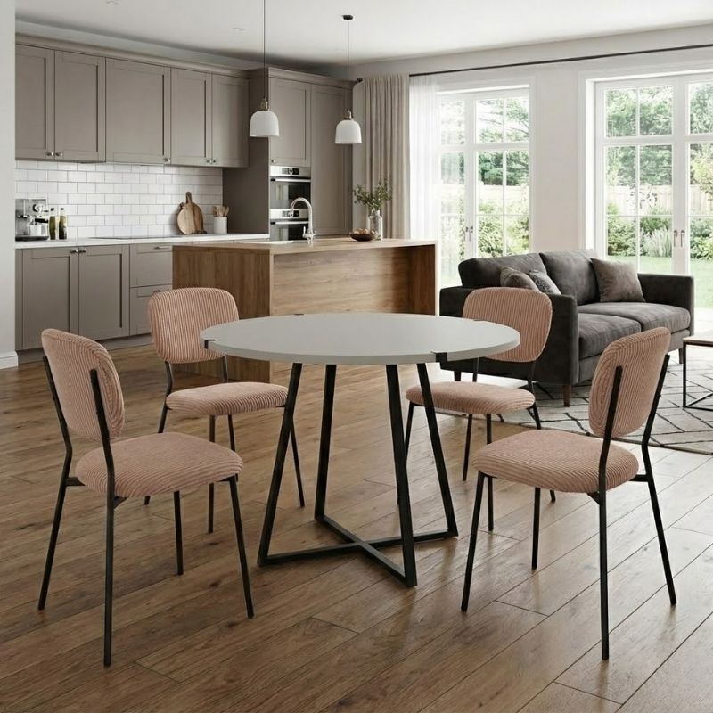Η τραπεζαρία Rubes - Kevin θα φέρει μία αίσθηση εκλεπτυσμένης κομψότητας στον χώρο σας. Το πλούσιο κοτλέ ύφασμα της καρέκλας χαρίζει ζεστασιά και υφή, ενώ τα μεταλλικά πόδια προσδίδουν μοντέρνο χαρακτήρα και σταθερότητα. Ιδανική επιλογή τόσο για το σπίτι όσο και για επαγγελματικούς χώρους που θέλουν να επικοινωνήσουν ποιότητα και design σε κάθε λεπτομέρεια.