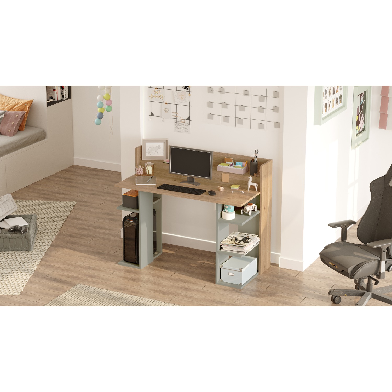 - Μεγάλη και άνετη επιφάνεια εργασίας με ράφι πίσω που δένει αρμονικά με την υπόλοιπη επιφάνεια