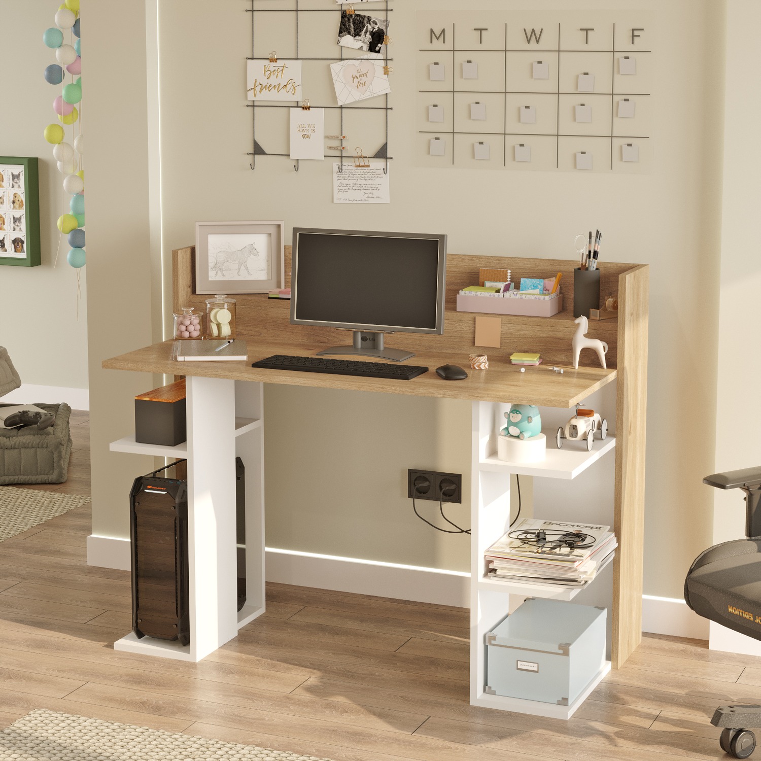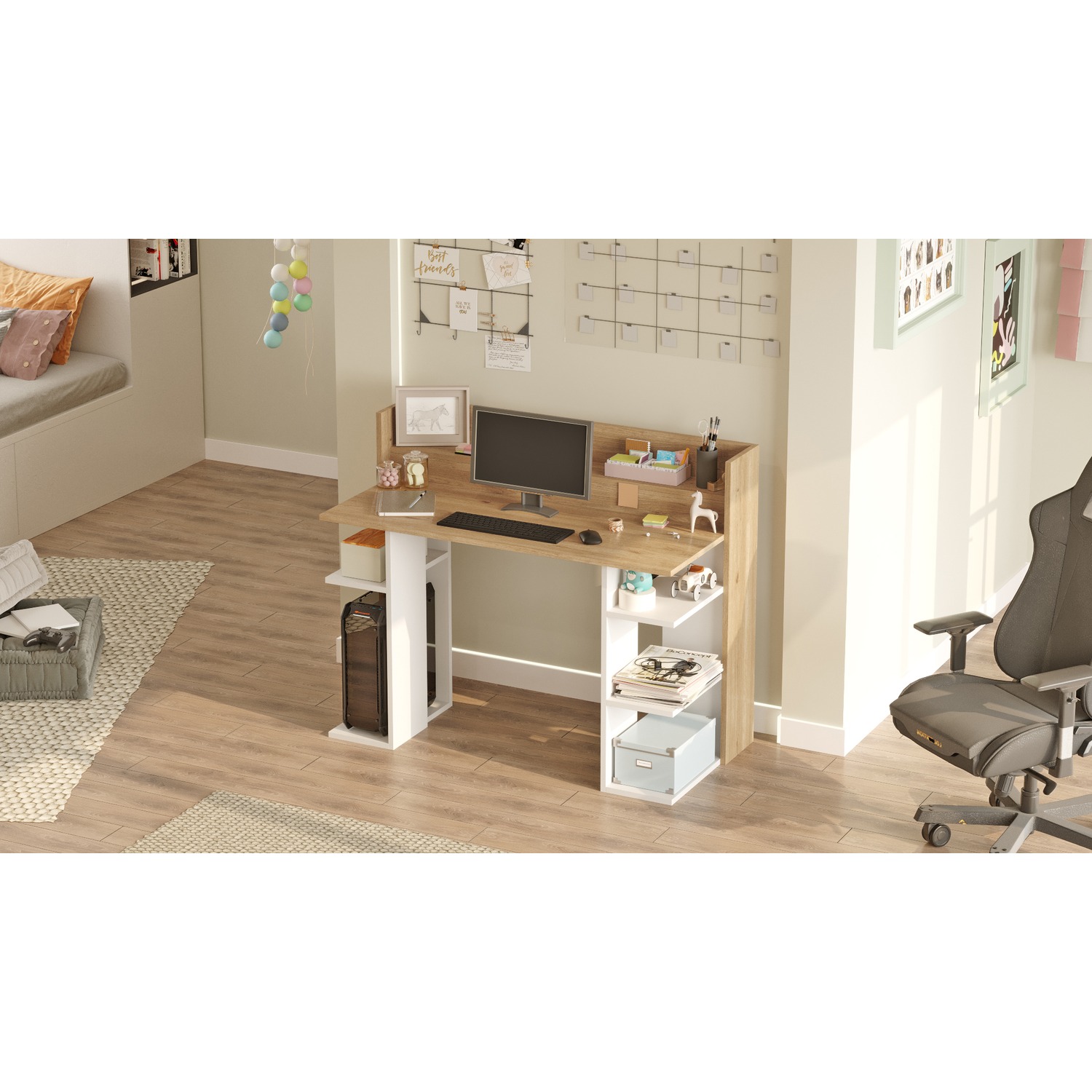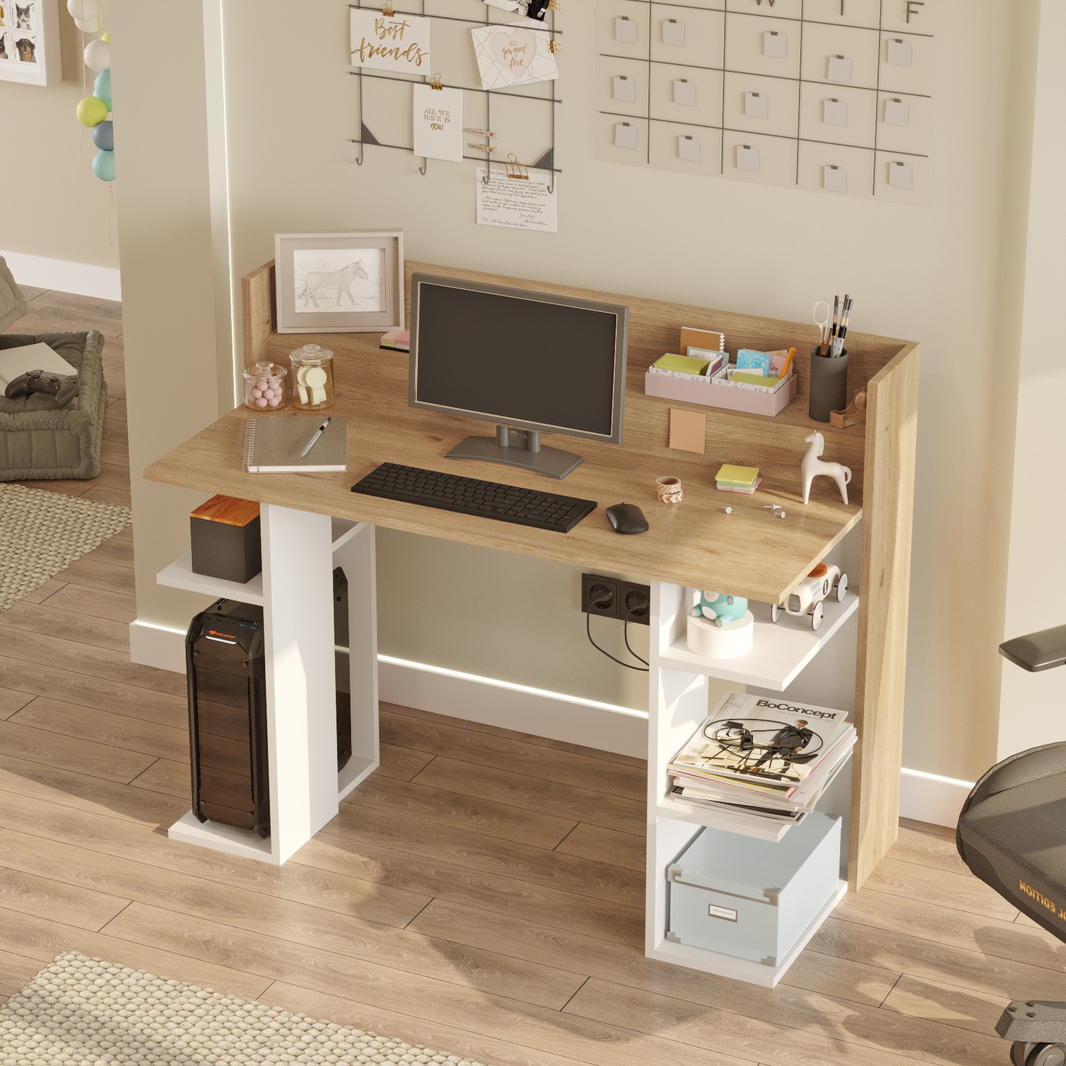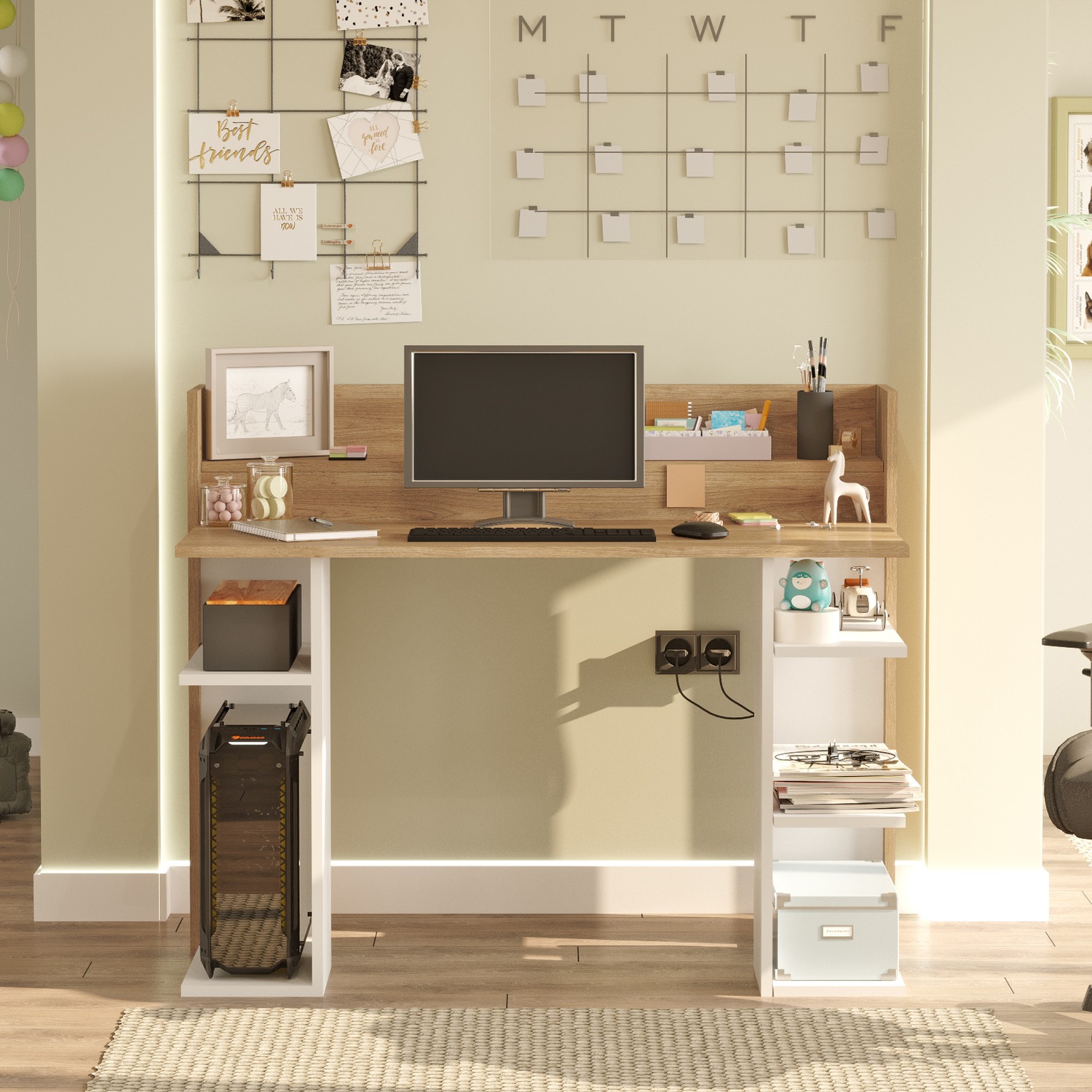 - Μεγάλη και άνετη επιφάνεια εργασίας με ράφι πίσω που δένει αρμονικά με την υπόλοιπη επιφάνεια